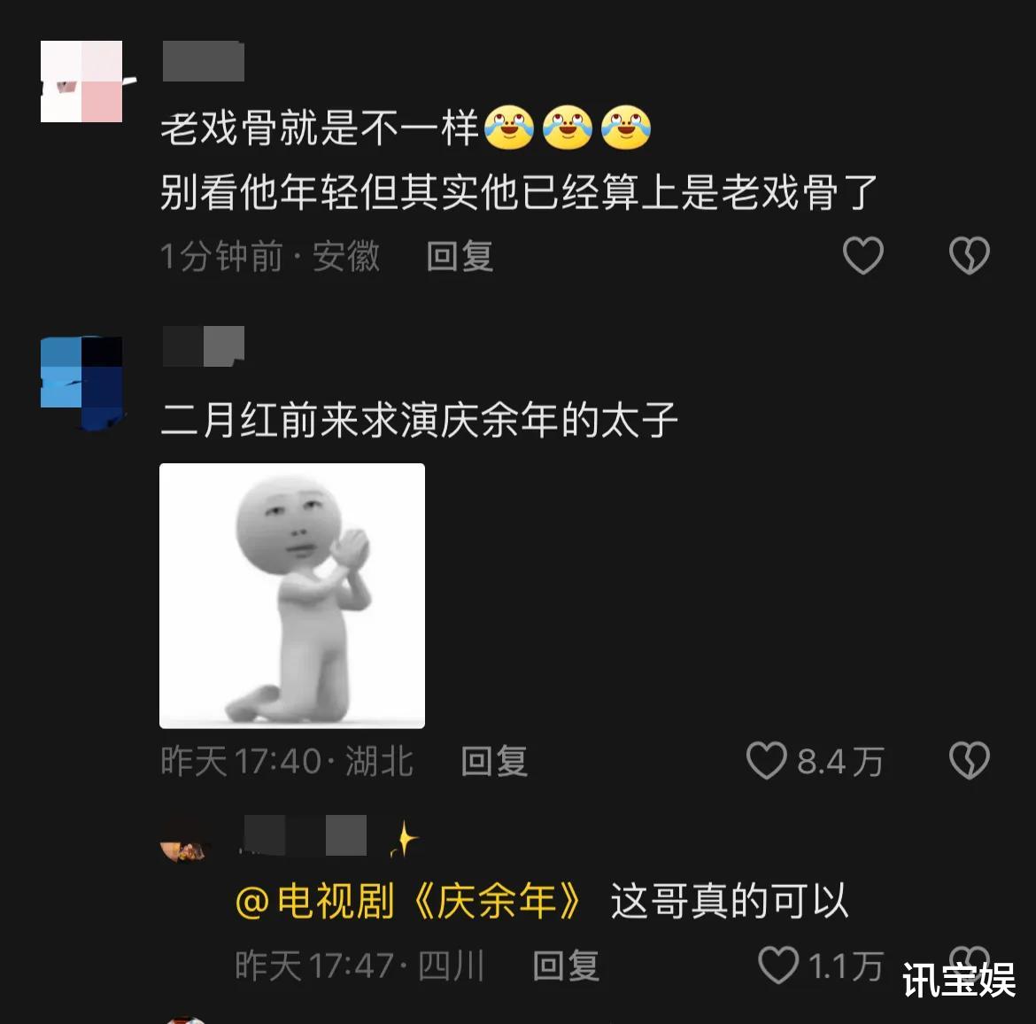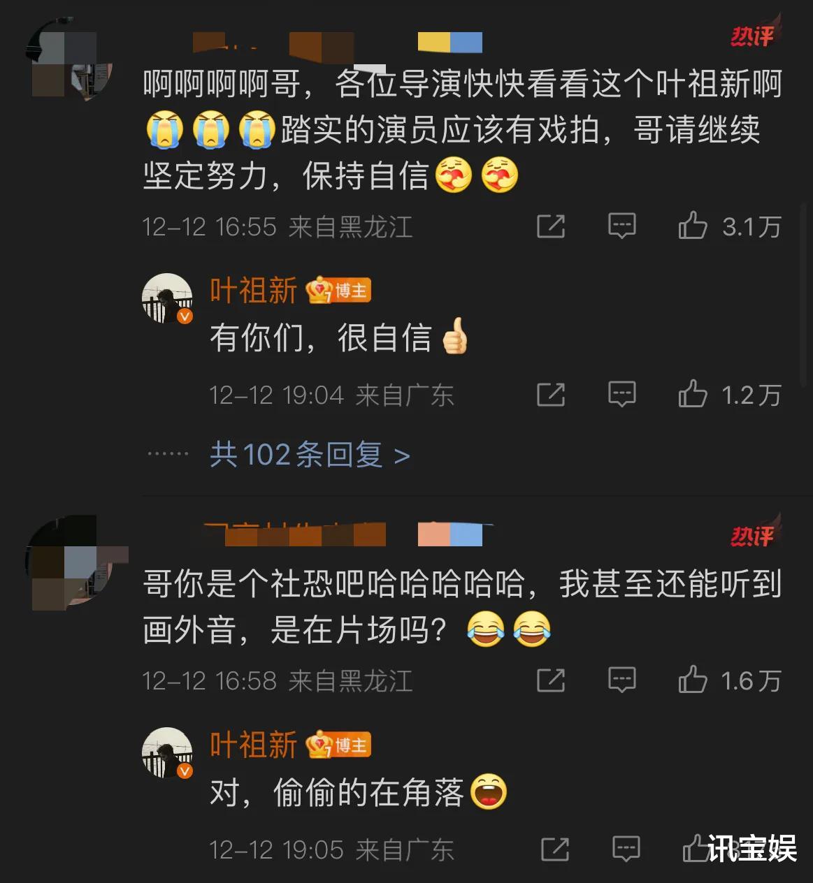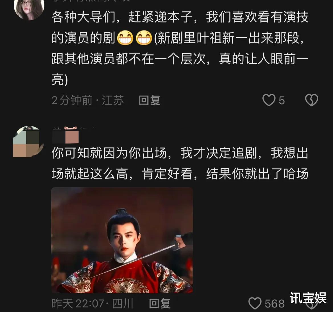 网友:各种大导们,赶紧递本子,我们喜欢看有演技的演员的剧,新剧里叶祖新一出来那段,跟其他演员都不在一个层次,真的让人眼前一亮。