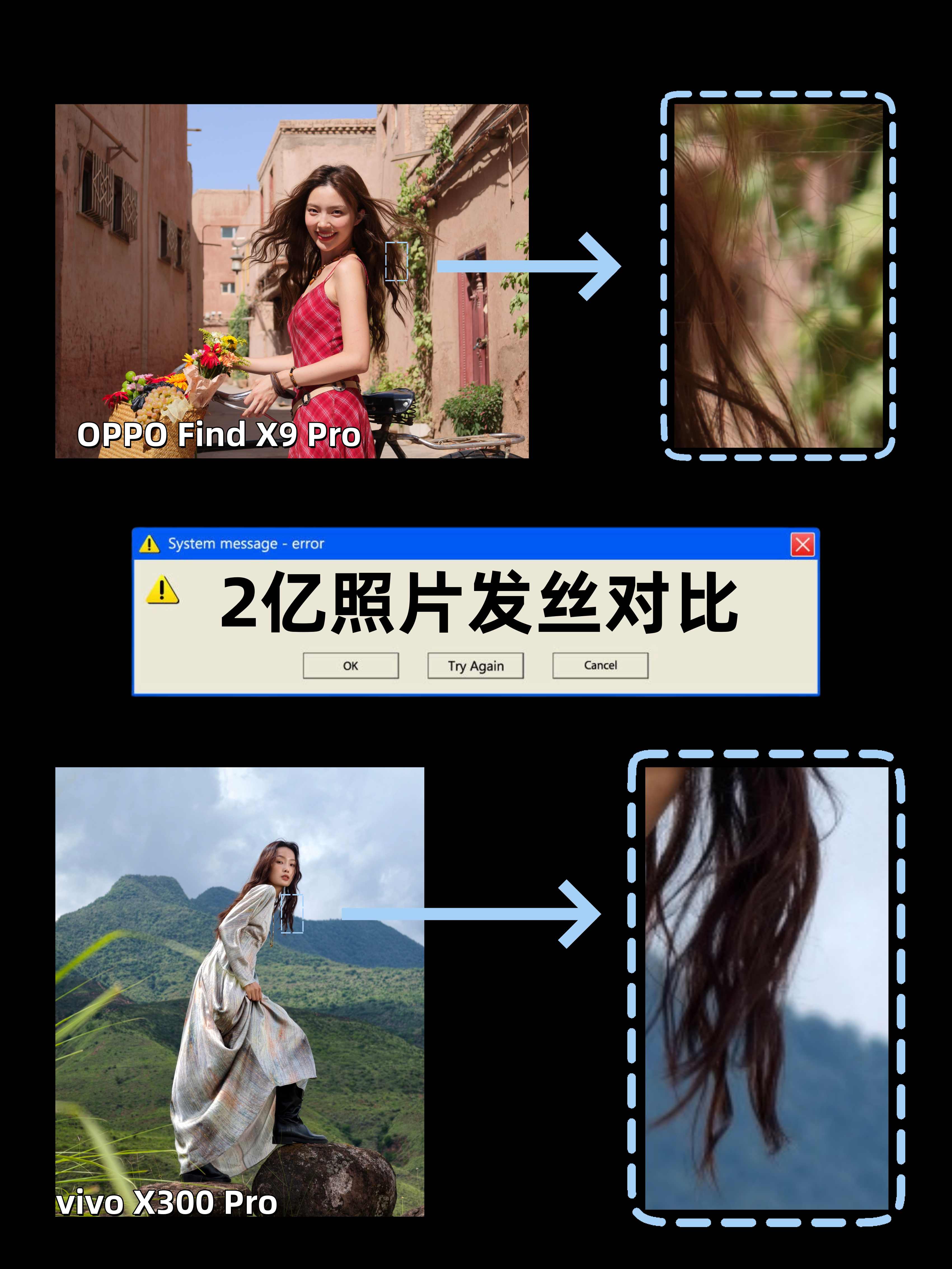 这回OPPO真是把头发丝的状态还原出来了,真的风一吹就跟蜘蛛丝一样,放大来看每一根都非常明显有区分,相比之下vivo的头发状态更像是抹了发胶的一样,整体轮廓是有的,但要说根根分明那不至于。