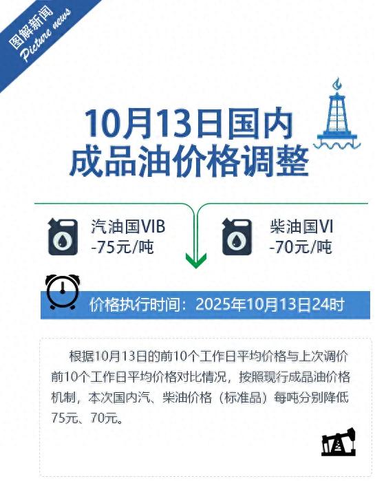 从10月13日24时起,国内汽、柴油每吨分别下调75元和70元,全国平均来看,92号汽油、95号汽油和0号柴油每升均下调0.06元。