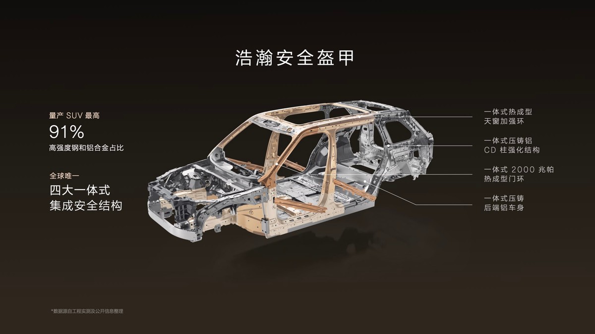 依托超标安全标准,极氪9X以全球最强车身安全体系打造浩瀚安全盔甲。白车身高强度钢与铝合金占比高达91%,搭载全球唯一“四大一体式集成安全结构”,实现同级最强41600N·m/deg车身扭转刚度,并通过行业首个单车四向连环极限碰撞测试,成为豪华旗舰SUV领域的安全新标杆。