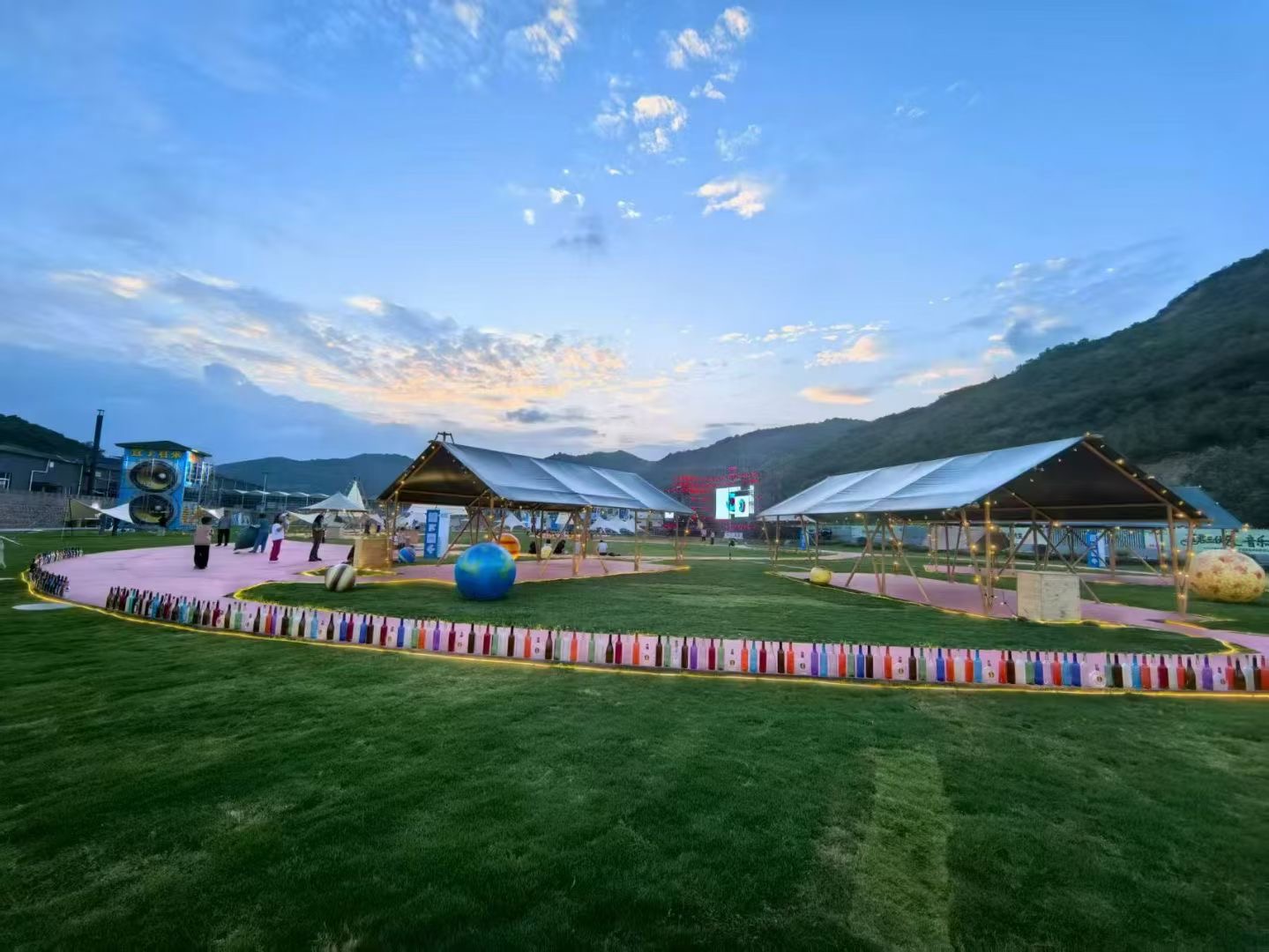 【玩水区】蓝色充气水池 + 高压水枪阵。据说开营后能打水仗、玩泡泡,水球大战,光看着就想跳进去!【音乐舞台区】舞台配彩色灯带,演唱会风格的大屏,真的超有感觉。会有乐队 live、DJ 打碟,还有非遗《打连钱》舞蹈,到了晚上氛围感十足~