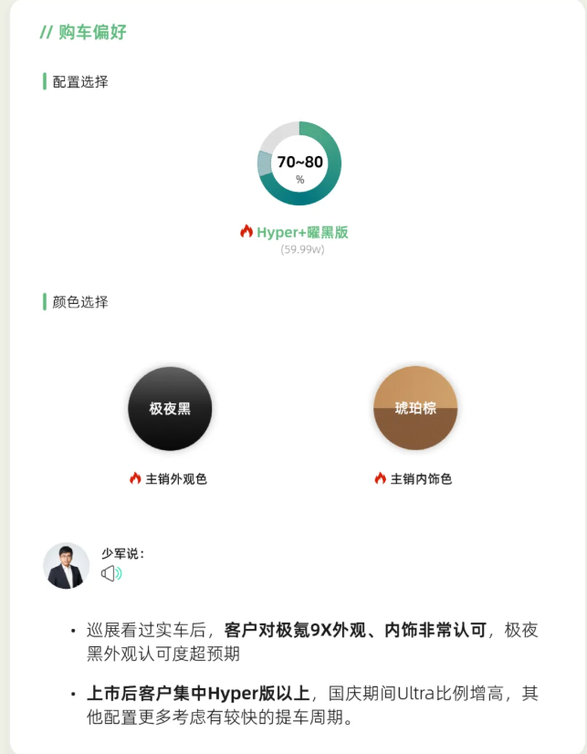 刚出炉的极氪9X一线快报越看越让人上头,亮眼的数据先放一边,那个配置选择给我整不会了,超过七成用户直冲顶配Hyper版级以上?意思是现在的老板都不差钱的嘛?