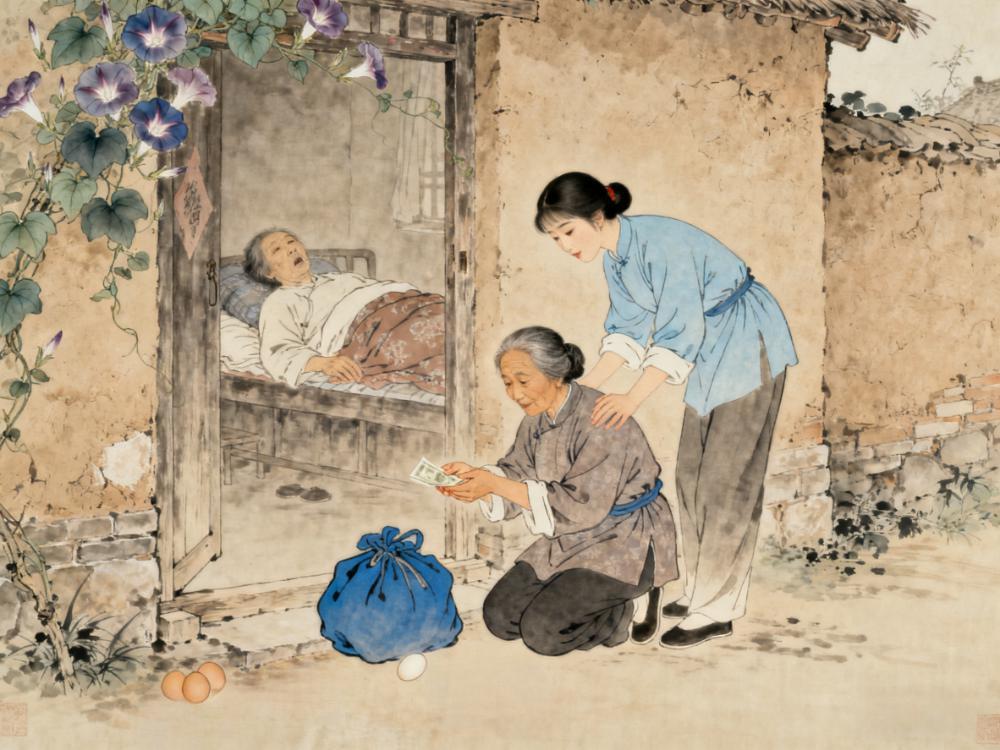 李姑娘家在邻村的东头,一间矮矮的土坯房,院墙是用泥土堆的,上面还爬着些牵牛花。王婶刚走到门口,就听见屋里传来咳嗽声,一声声的,听得人心慌。她深吸了口气,推开虚掩的门,看见李姑娘正坐在床边,给一个老太太擦脸 —— 老太太脸色苍白,嘴唇干得起皮,正是李姑娘的娘。