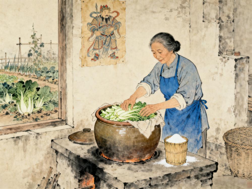 灶台上放着个大坛子,是去年腌菜剩下的,王婶早上已经把芥菜洗好晾着了。她把芥菜切好,撒上盐,一层菜一层盐地往坛子里码。正码到一半,邻居张婶在门口喊:“王婶,借你家的酱油用用,我家的没了。” 王婶应了声,赶紧出去给张婶拿酱油,忘了把坛子盖盖上。