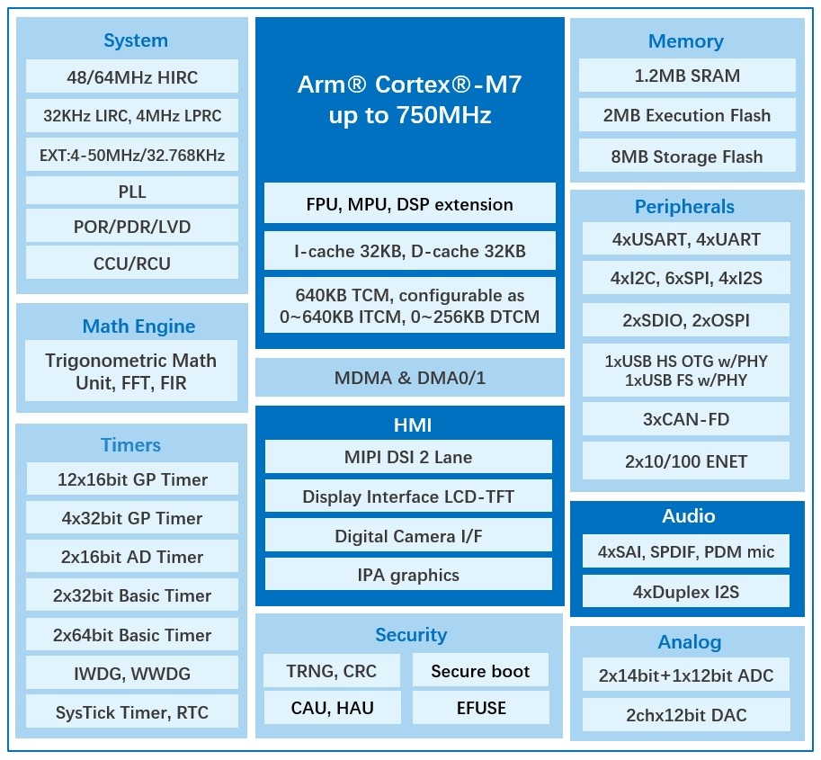 该系列拥有优异的存储配置,集成了2MB Execution Flash与8MB Storage Flash,并搭载1.2MB的SRAM,其中特别配备高达640KB大容量紧耦合内存(TCM),可与CPU同频运行,实现指令与数据的零等待执行。这一核心架构设计可让CPU以峰值效率持续运行,充分释放其全部计算潜能,确保系统即便在极度消耗算力的实时任务、复杂控制算法及高频数据处理中,也能实现更快、更稳定的代码执行,为高端嵌入式应用提供了至关重要的性能基础。