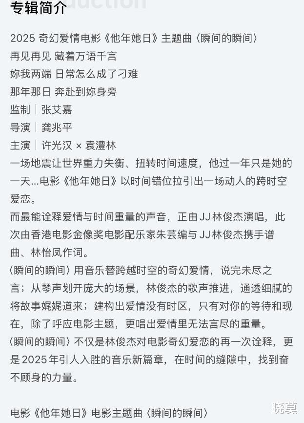 就在今天林俊杰在社交平台上发布2025 奇幻愛情電影《他年她日》主題曲《瞬間的瞬間》正式上线,音乐恰如人心中最柔软的部分,能够在最不经意的瞬间打动我们,而2025年,带来了一个超越时空、融合奇幻爱情的音乐作品《瞬间的瞬间》,这首歌曲作为电影《他年她日》的主题曲,通过音符为观众呈现了一段跨越时空的爱情故事,也让我们在旋律的波动中感受到了那份在瞬间即永恒中的深刻情感。
