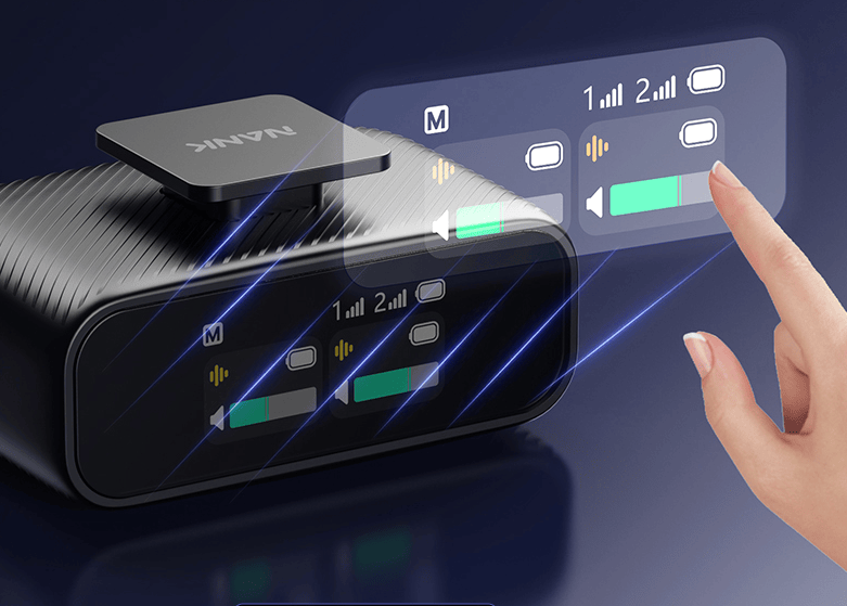 在硬件层面,Qmic 搭载 双核 DSP 芯片 与 6mm 电容拾音模组,提供更高算力与灵敏度,支持 48kHz/24bit 高清录音 与 32bit 浮点内录,即使无线信号中断也能保留完整音频,避免素材丢失。它还配备 MicTouch 智能触控系统,将声道切换、增益调节、电量监测、安全音轨开关等功能集成在高清触控屏上,告别传统盲录,操作直观高效。