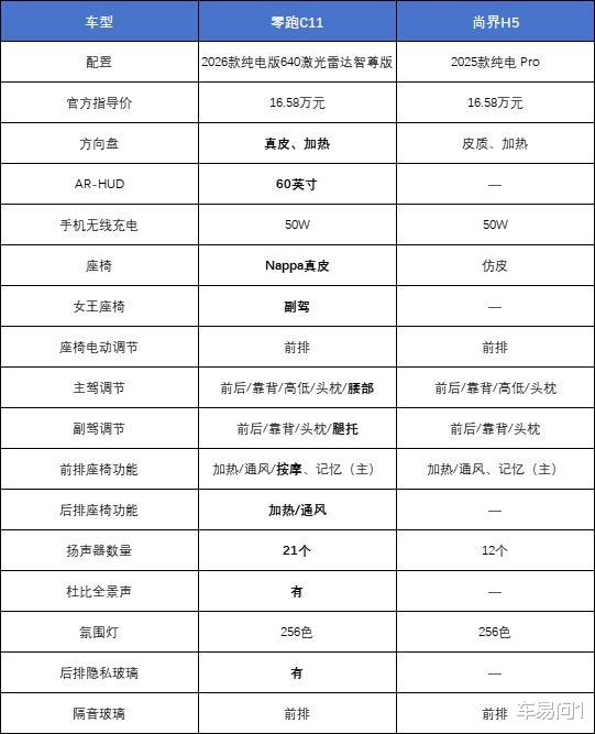 关于配置,由于它们的入门款价格差距比较大,所以我们选同样是16.58万的零跑C11 2026款纯电版640激光雷达智尊版,与尚界H5 2025款纯电Pro比较一番,供大家参考。