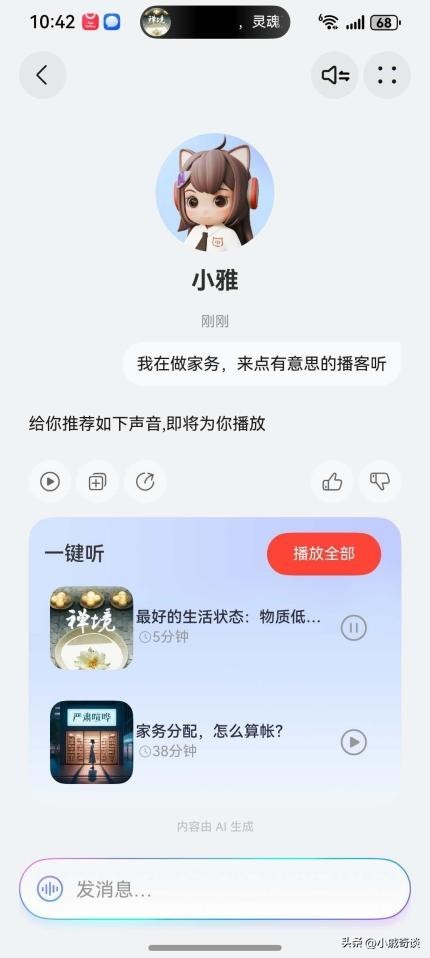 没想到,小雅Agent推送的内容迅速又“对味”:不仅有谈论生活哲学的分享,甚至有关于“家务分配”的社会学话题探讨。原本乏味的家务时间瞬间变得有趣,仿佛身边多了个看不见的“聊天搭子”。