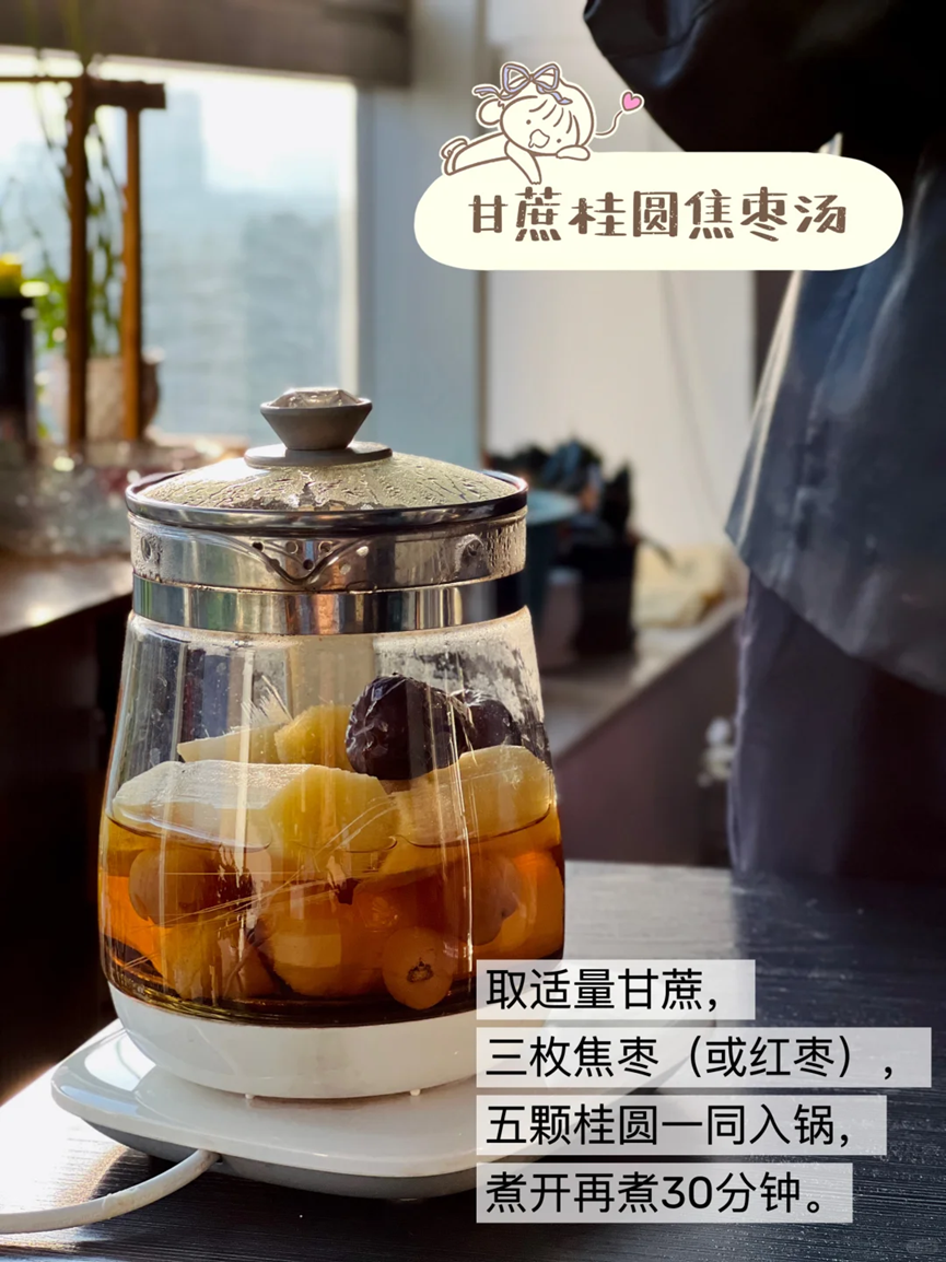 女性朋友还可以使用养生壶来制作甘蔗桂圆焦枣汤,