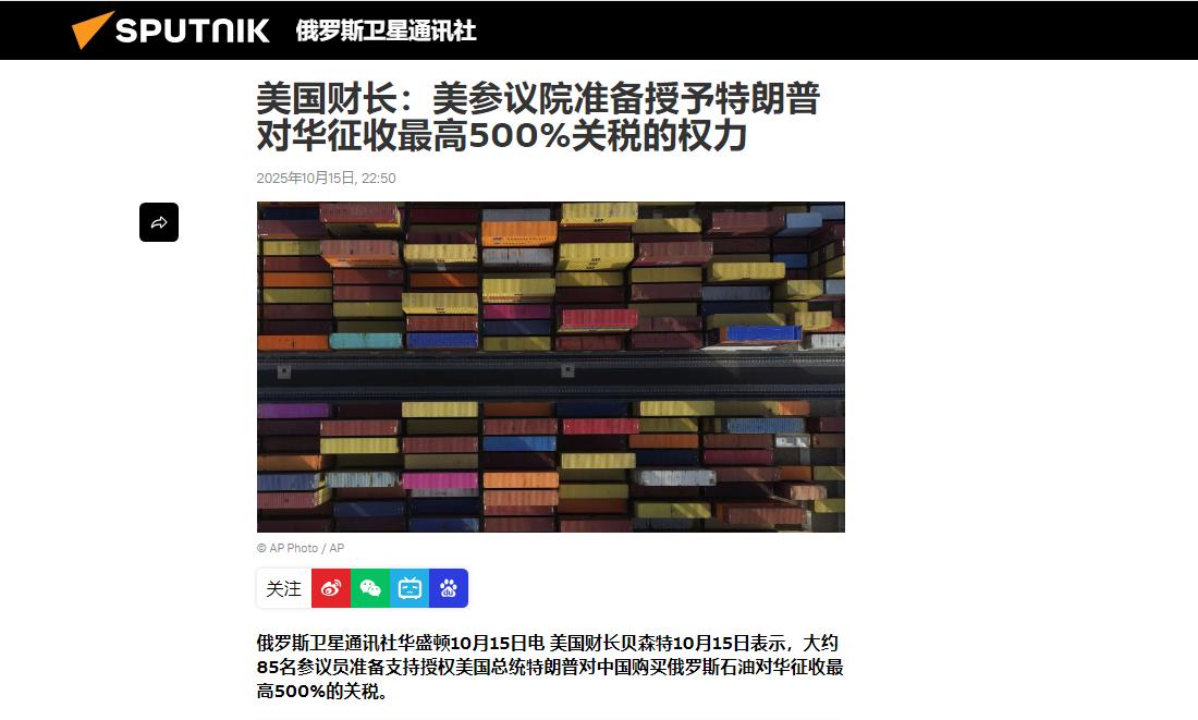 10月16日,俄罗斯卫星通讯社华盛顿消息, 美国财长贝森特在当地时间10月15日表示,大约85名参议员准备支持授权美国总统特朗普,通过中方继续购买俄油,可以对华征收最高500%的关税。