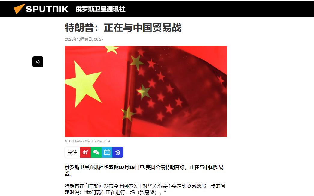 10月16日,据俄罗斯卫星通讯社报道,之前一直在公开场合表示,中美关系很好。这次改口了,不藏着掖着了,直接了当的表示,我们正在开打贸易战。