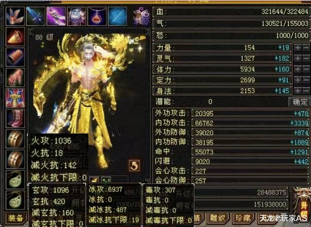 先上面板:血量32万,蓝量15万,内功攻击6.6万,命中5.5万,闪避9020,会心攻击227,会心防御257,主冰攻击近7000,火攻击1036,玄攻击1096!