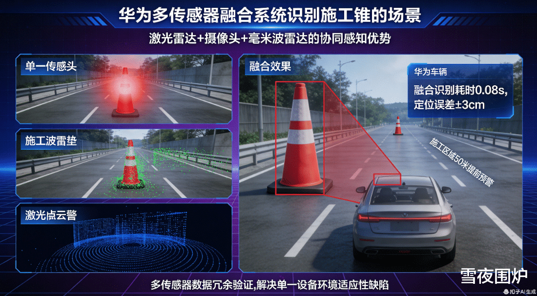 华为则采用**“激光雷达+摄像头+毫米波雷达”多传感器融合路线**,结合BEV(鸟瞰图)+Transformer架构,实现200米外高精度障碍物识别(如施工路段、急弯、故障车辆)。这种路线的优势在于: