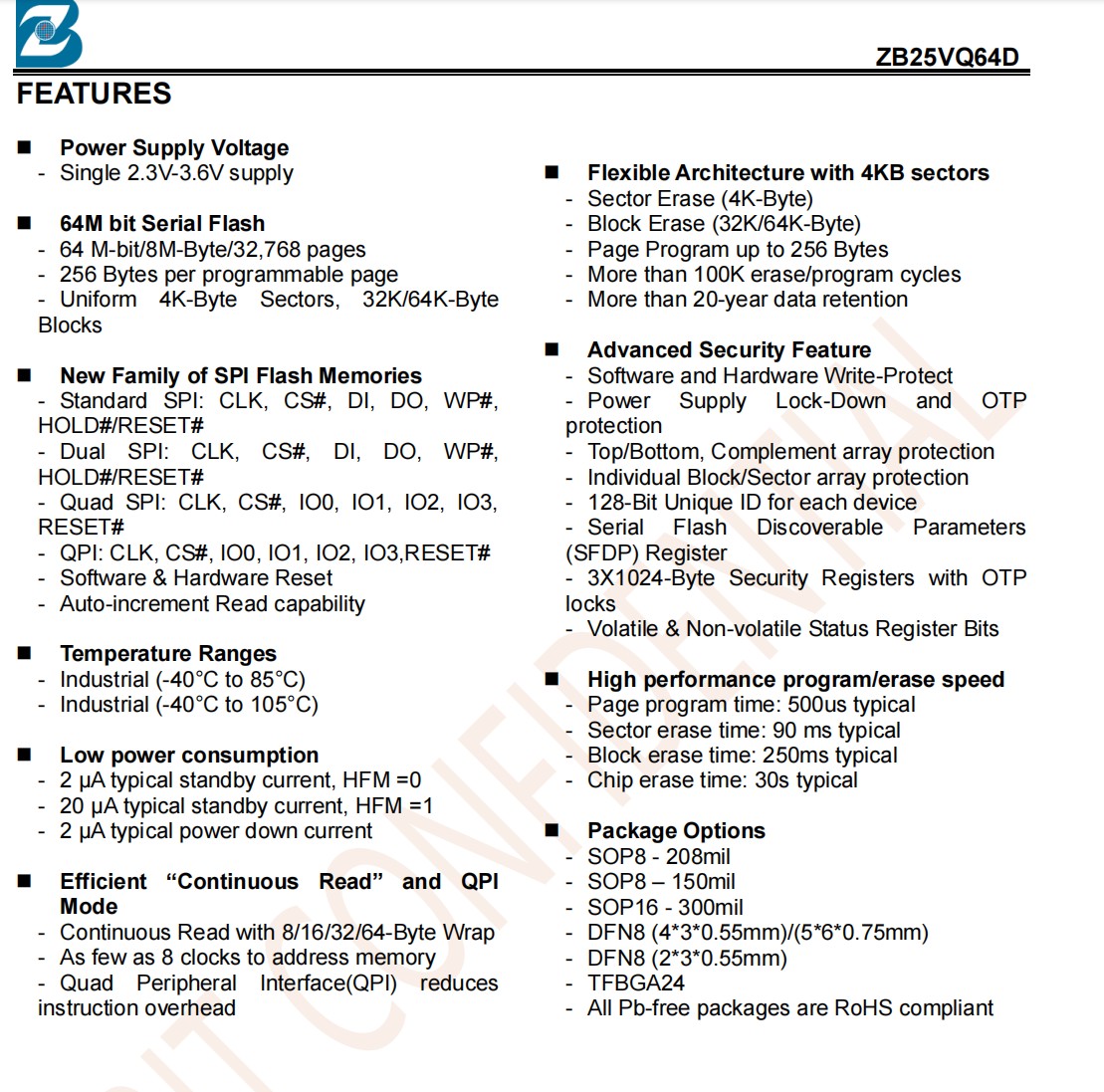 ZB25VQ64D拥有64兆位(64M-bit)的存储容量,相当于8兆字节(8M-Byte) 22。它的内部存储结构非常灵活,可以分成多个4KB扇区、32KB/64KB块以及每页256字节,可以满足不同数据存储的需求 33。