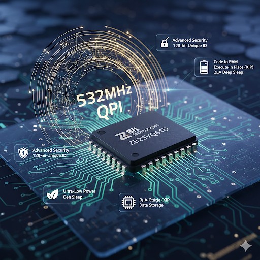 ZB25VQ64D内置了多项安全功能,全方位保护数据 77。它支持软件和硬件写保护功能,可以防止数据被意外修改 8。此外,它还拥有一个128位的唯一ID,就像每个芯片独一无二的“身份证”,可以用于系统防克隆和身份验证。它还拥有三个1024字节的安全寄存器。超低功耗,节能环保在深度掉电模式下,这款芯片的典型功耗低至2微安(μA),大大节省电量,特别适合电池供电的便携设备。