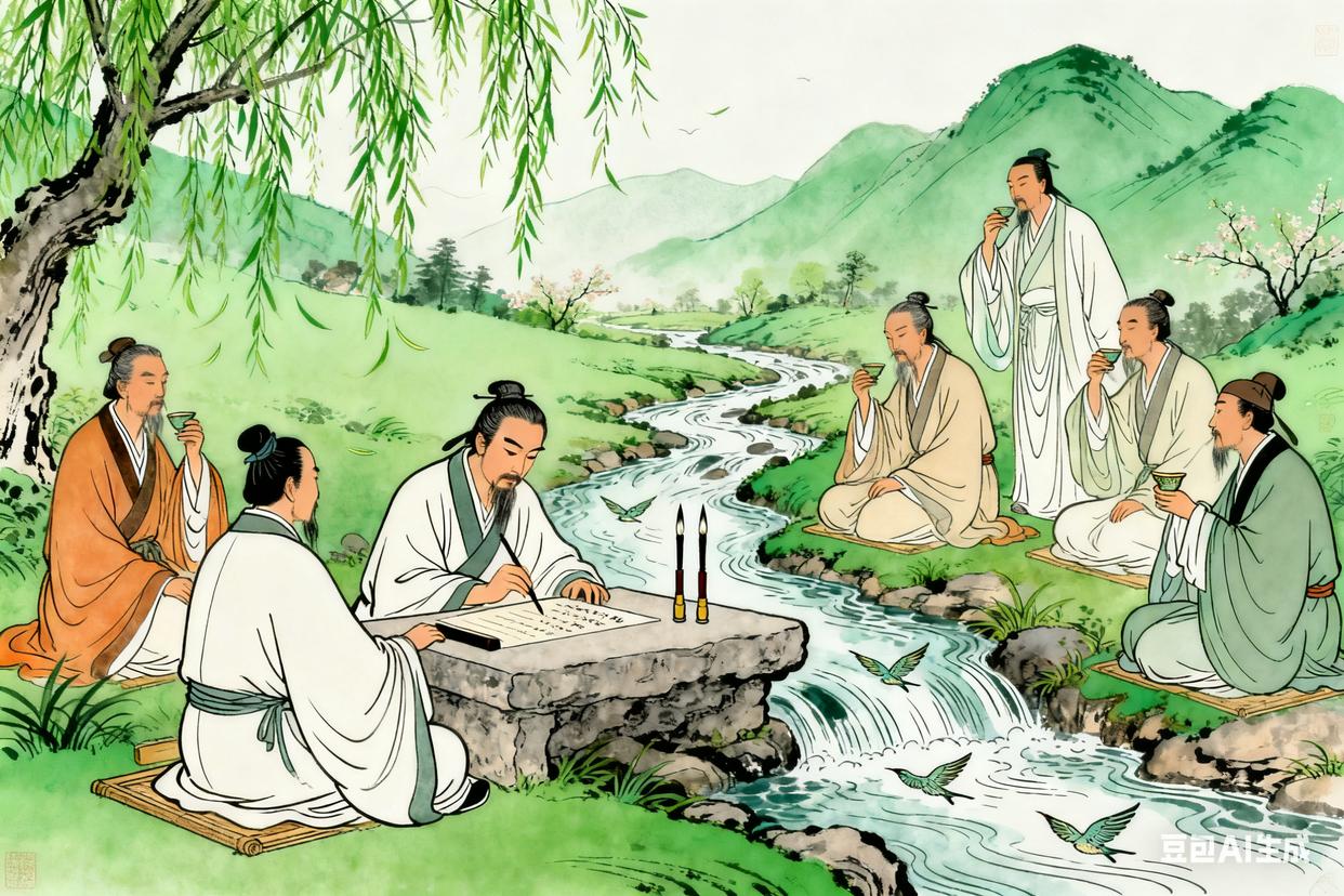 永和九年的修禊日,他邀了谢安、孙绰等四十二位名士来兰亭。那天春风暖得像浸了蜜,溪水里漂着盛酒的羽觞,有人吟诗作赋,有人抚琴高歌。他坐在石案前,看着眼前的青山绿水,想着这些年的颠沛流离,忽然觉得心里有好多话要写。他拿起笔,墨汁在纸上晕开,“永和九年,岁在癸丑,暮春之初,会于会稽山阴之兰亭,修禊事也”——这些字像从心里长出来的,带着溪水的清冽和春风的软。