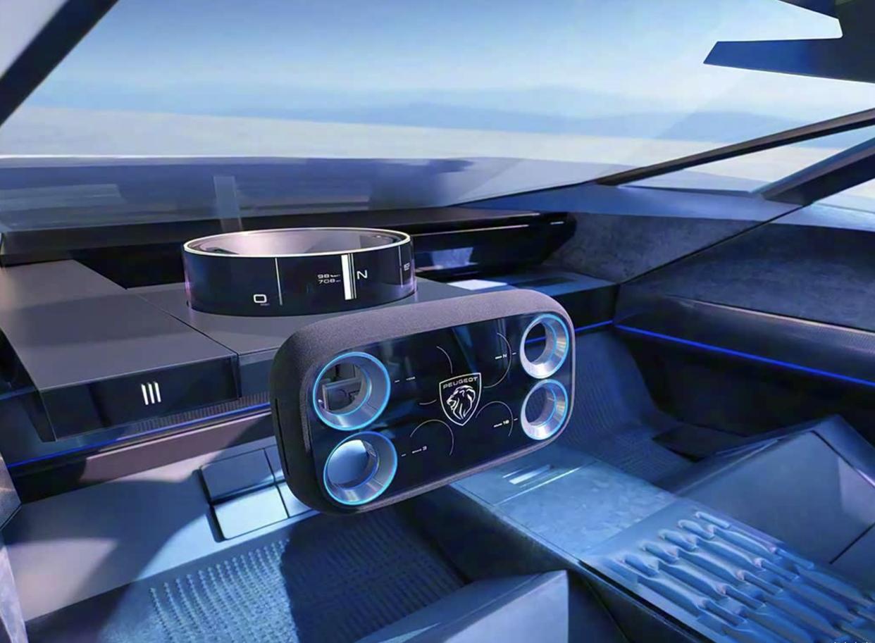 标致Inception概念车采用了全新的i-Cockpit座舱,全新的布局让整车看上去更加简约,且不缺乏科技感和时尚感。座舱内部采用了浅蓝色和深蓝色拼接的Alcantara面料铺陈,还加入了蓝色的氛围灯,毫无违和感。中控台配备了圆角矩形方向盘,内部拥有双排共8个圆圈,中间的四个圆圈是速度、转速、电量、挡位显示,两侧边缘的四个圆圈是手柄和手势控制按键。正前方配备了21英寸浮动式屏幕以及线性转向系统。