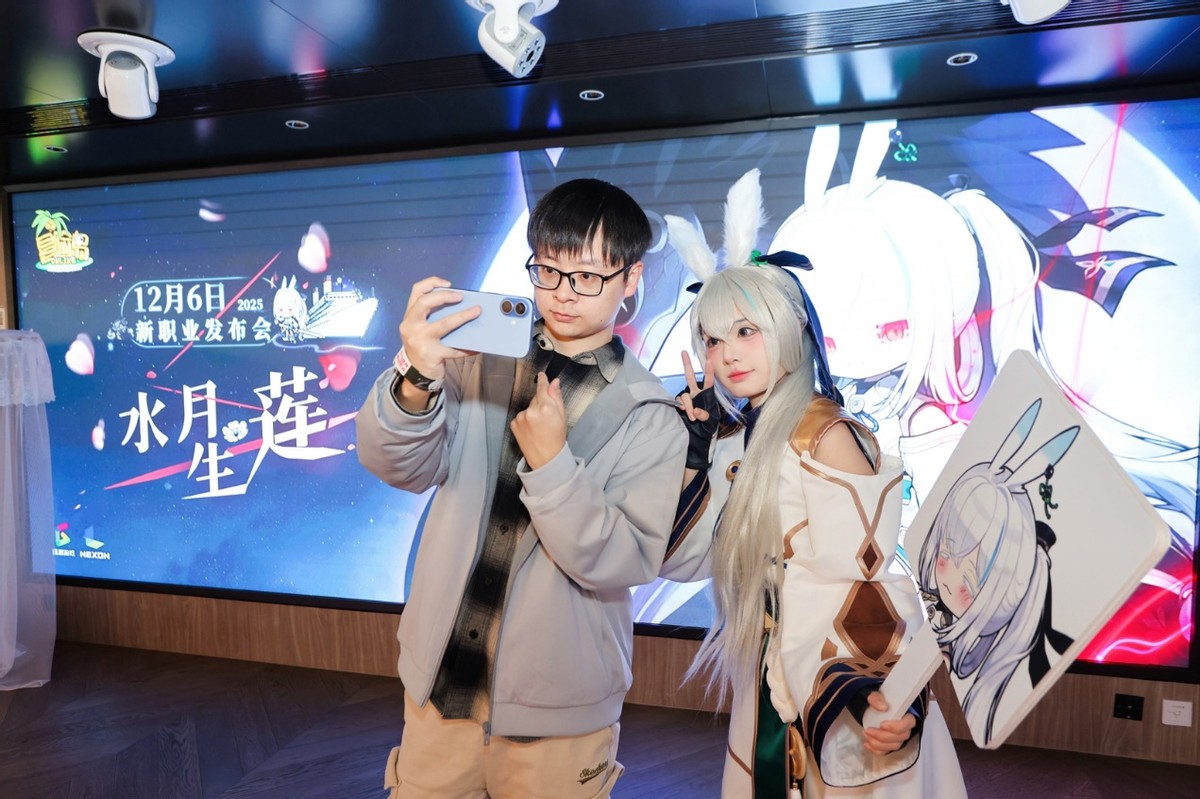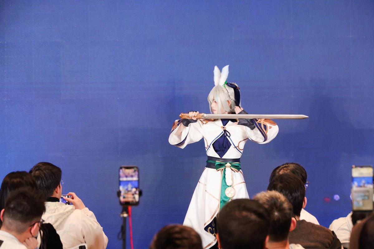 作为官方特邀嘉宾,人气主播火线妹首次以“莲”的COSPLAY造型惊艳亮相。她以一袭白色长发与灵动兔耳完美复刻角色形象,服装细节也高度还原游戏原画设定,将“莲”飒爽又可爱的气质演绎得惟妙惟肖,吸引了不少玩家上前合影集邮。而在发布会新职业介绍环节,伴随舞台光影流转,她手持梅花剑翩然起舞,一招一式间仿佛“莲”破次元而至,为玩家们呈现了一场精彩的剑舞表演。