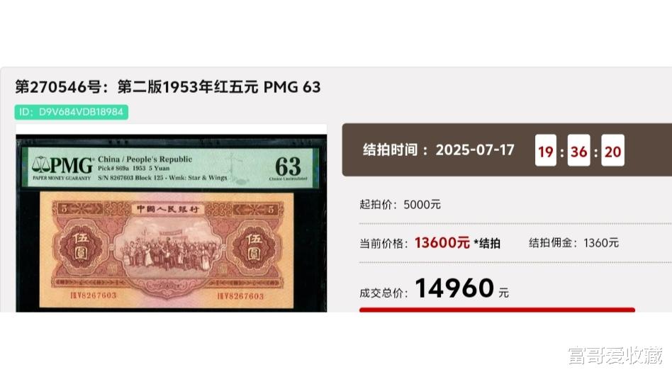 在2025年7月份的“春秋大拍”中,一张1953年的“红五元”,PMG评级分数63分,最后拍出了14960元。