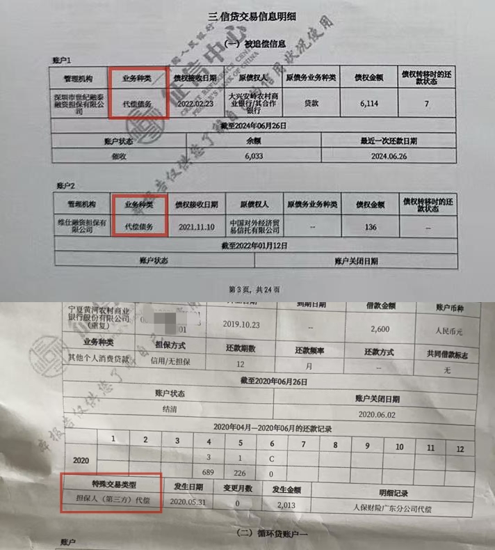 如果你的报告出现了图中的这两种代偿,一种是结清后的,另一种是未结清的,未结清的一定要确认好,自己是否把三者之间所有的债务