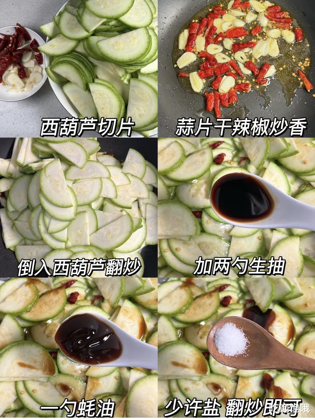 2⃣️锅里油热蒜片、干辣椒炒香,倒入西葫芦翻炒,加两勺生抽,一勺蚝油,少许盐,大火翻炒就好啦