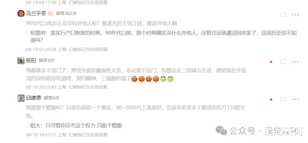 作为一个同样生活在这个城市里的上海人,我特别能理解这种感受,我就是这样的感受。这背后,其实是一种我们深深的“失序感”。你想象一下,你从小长大的家园,自己的家乡上海,我们美丽的家园,街坊邻居都知根知底,大家讲规矩,讲客气,日子过得安稳踏实。就是因为海纳百川,突然有一天,潮水一样涌进来无数陌生人,外地人像潮水一样涌入上海,挤破头也要挤进上海来,他们带着不同的口音、不同的生活习惯,甚至不同的生存法则。你熟悉的秩序被打破了,你心里能不慌吗?能不心痛吗?