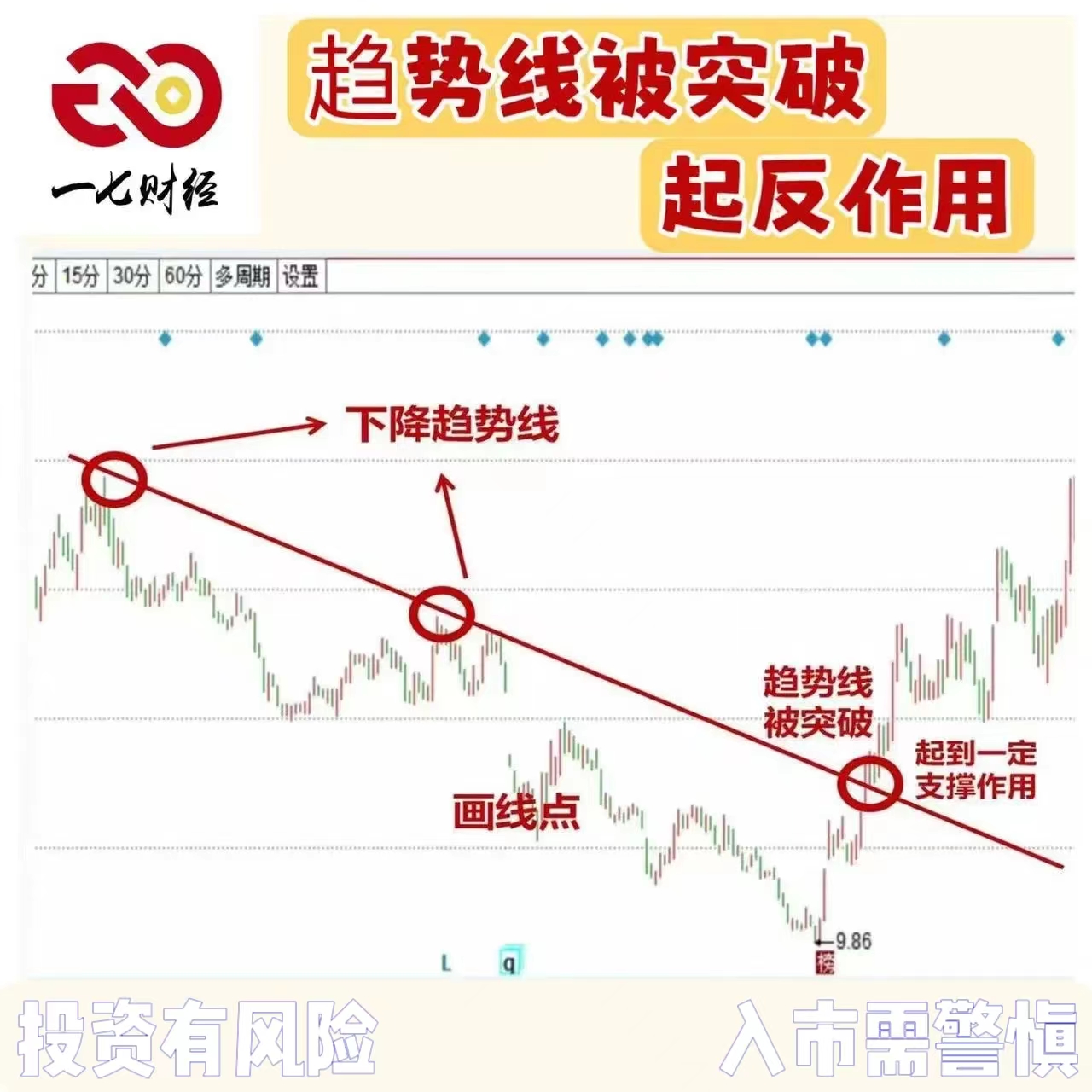 4、其次在高位就要注意价跌量增,这是主力出货的信号,大阴线跌破趋势线,这是要第一时间出场。