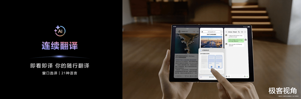 除了生产力提升,生活场景也被重新定义。孩子作业不会,拍照上传,小艺分步解题,还能生成错题集;规划家庭旅行,一句话指令,它自动生成带地图、住宿、美食的完整行程;浏览外文网页,连续翻译全程开启,输入法也能实时转译,沟通无阻。
