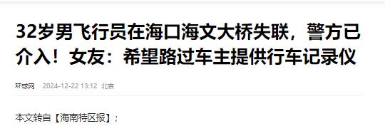 环球网——32岁男飞行员在海口海文大桥失联,警方已介入!女友:希望路过车主提供行车记录仪