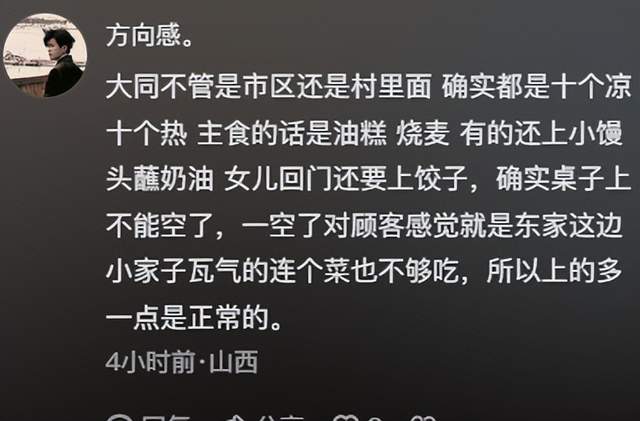 评论区也有山西当地的网友说到,在他们山西大同,不管是在市区还是村镇,这样的菜品标准10个凉菜10个热菜都是很常见的,对于婚宴负责人所说的菜量太少吃空桌子对客人不尊重也表示赞同,多一点是正常的。