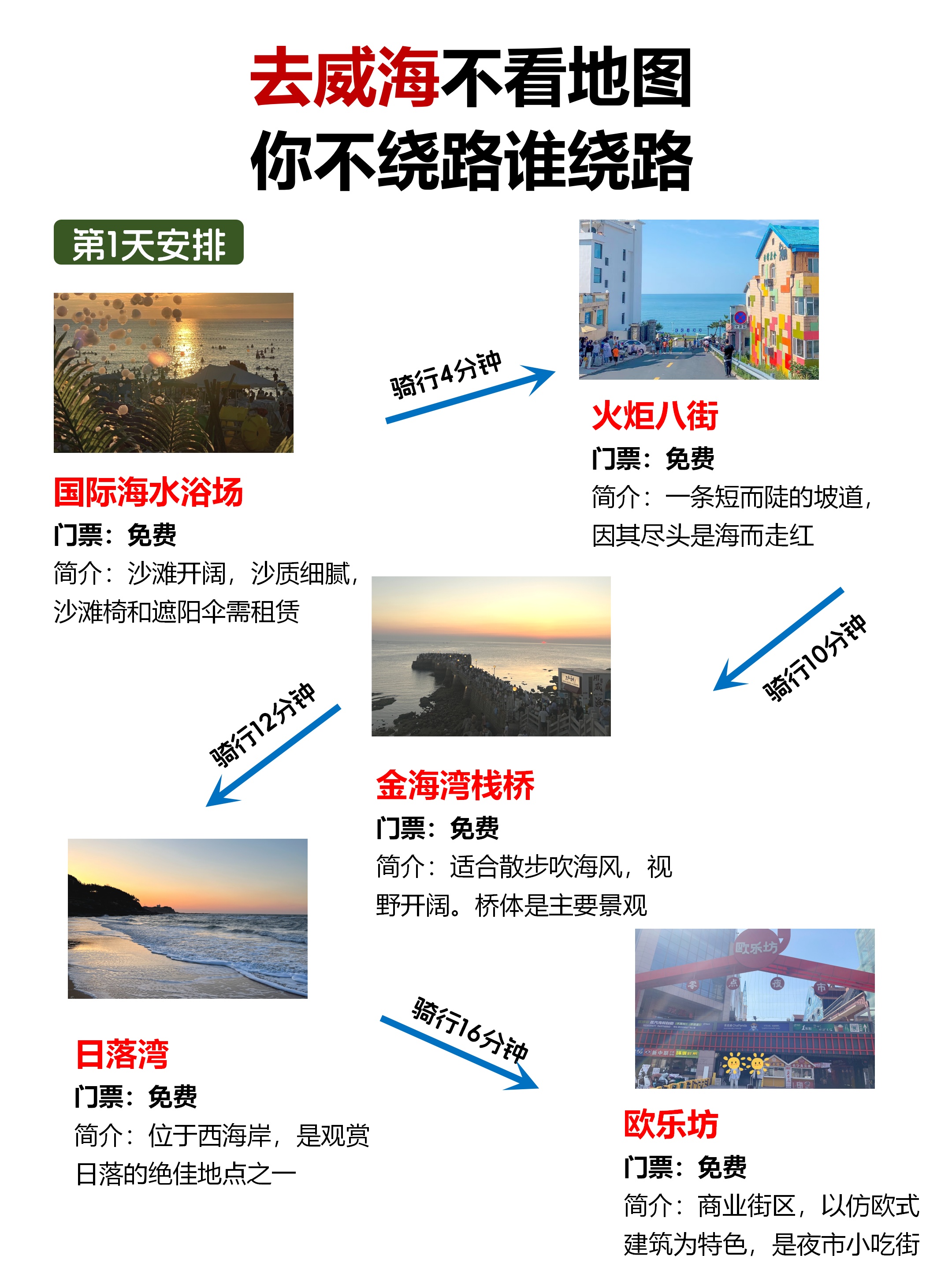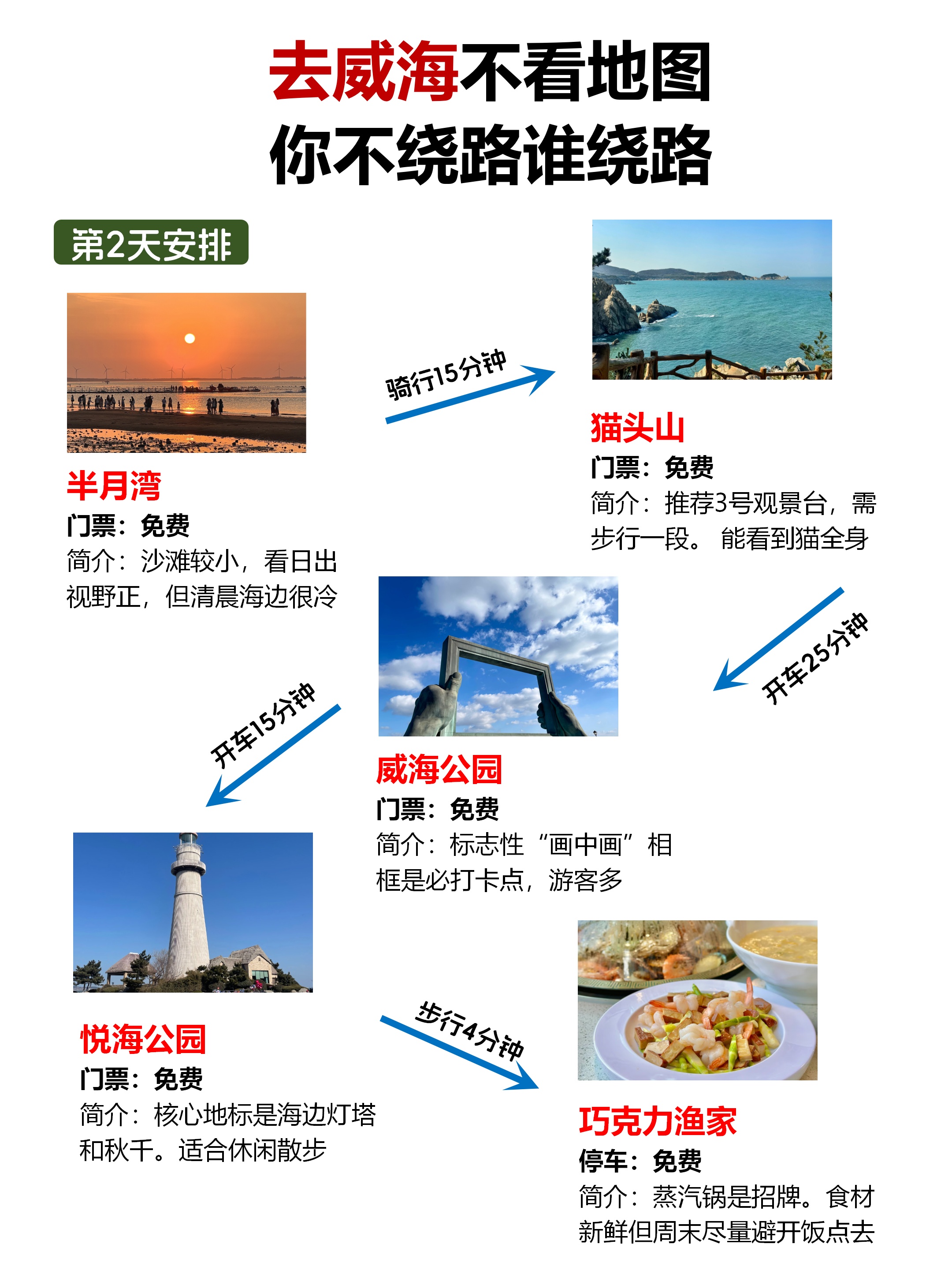 温馨提示:威海景点较为分散,第三天的荣成线路强烈建议包车或自驾,公共交通耗时且班次有限~