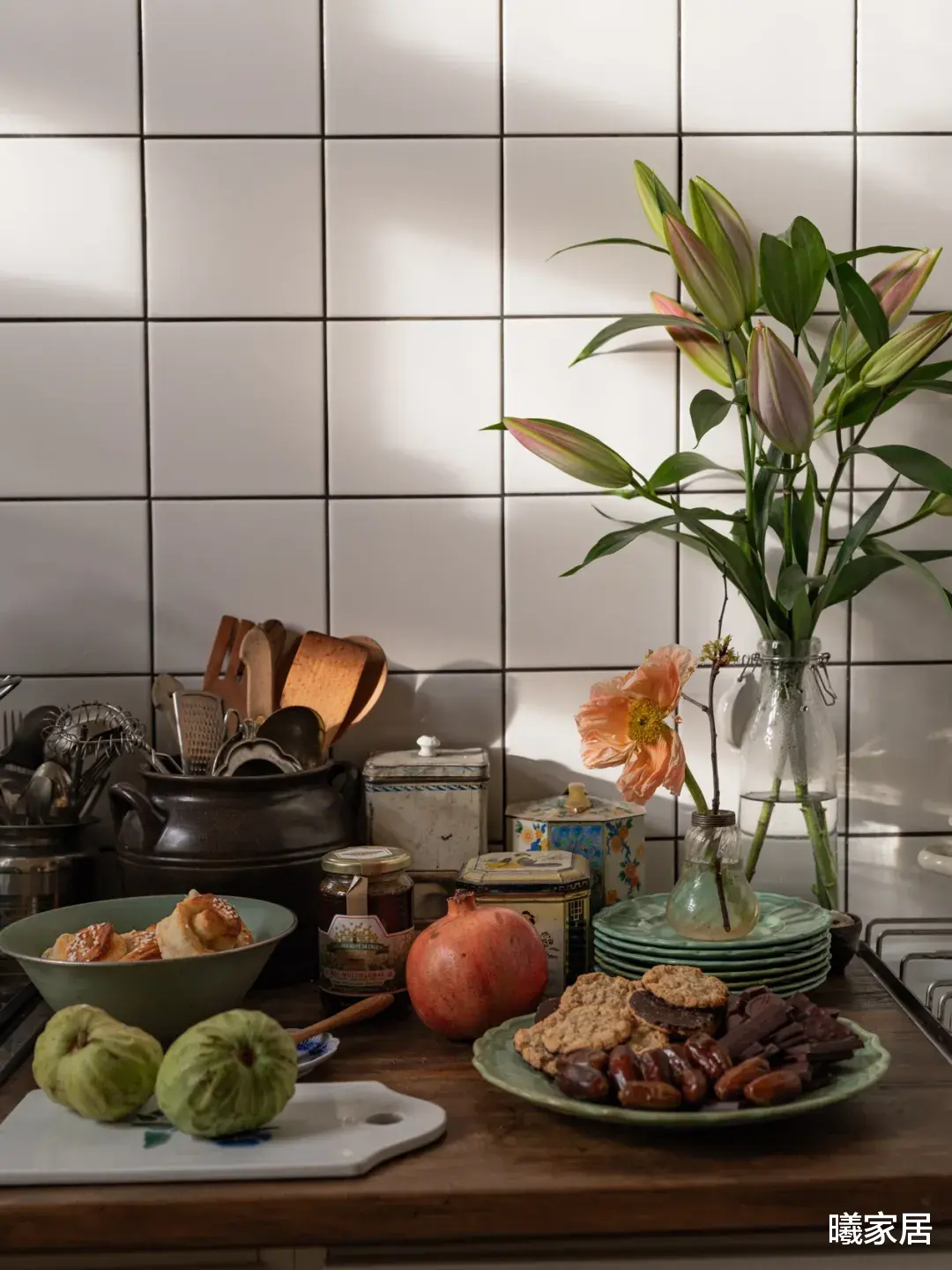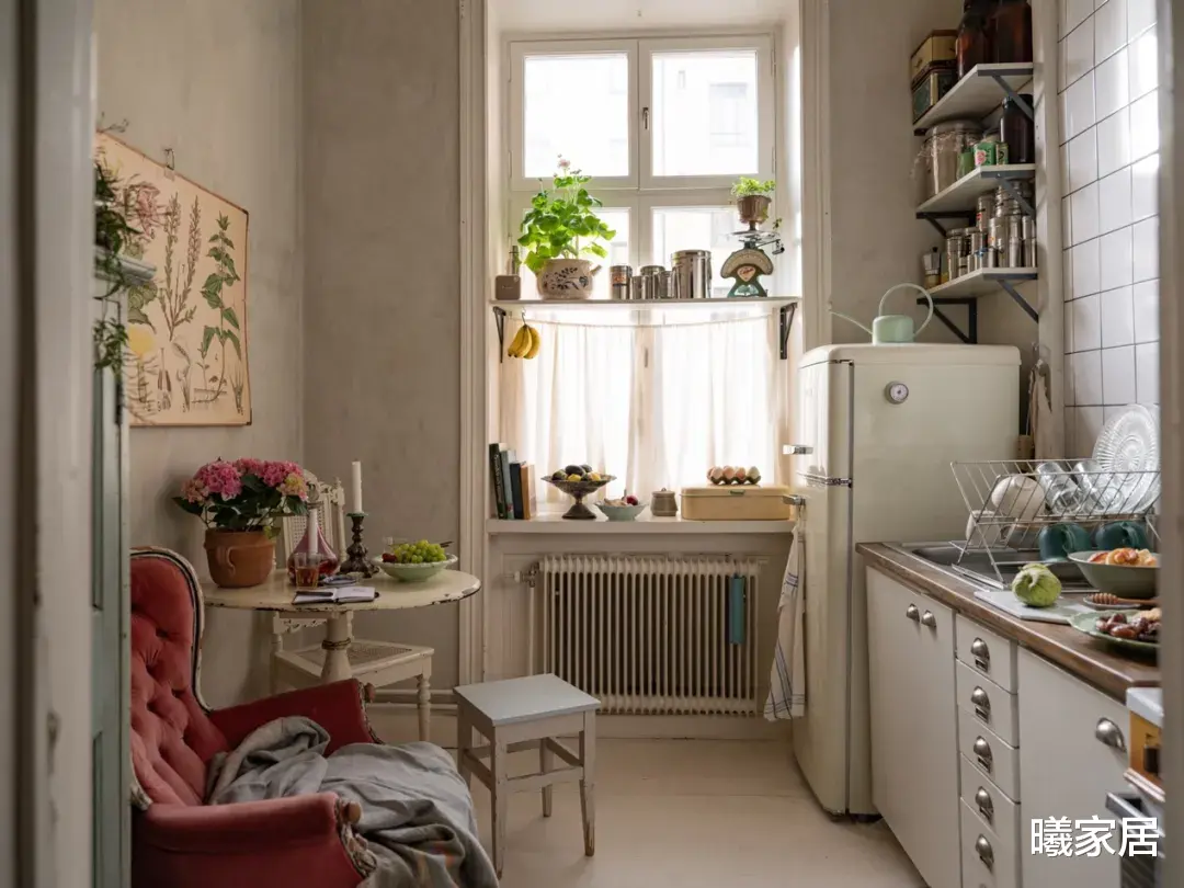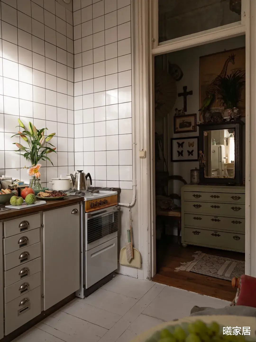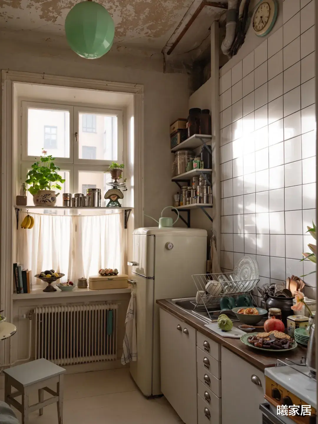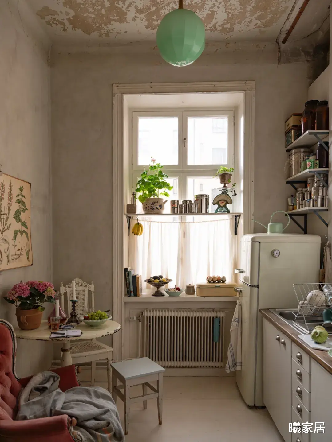 不需要四面大玻璃,一扇老窗更能让厨房变成精致的阳光房。掉漆的天花板,点缀的绿色吊灯,简单复古的橱柜,没有过多装饰,更专注于当下,去享受生活、感受生活。身在厨房因为阳光而富足,因生活的气息而幸福感爆棚,这样的画面谁能不爱呢?