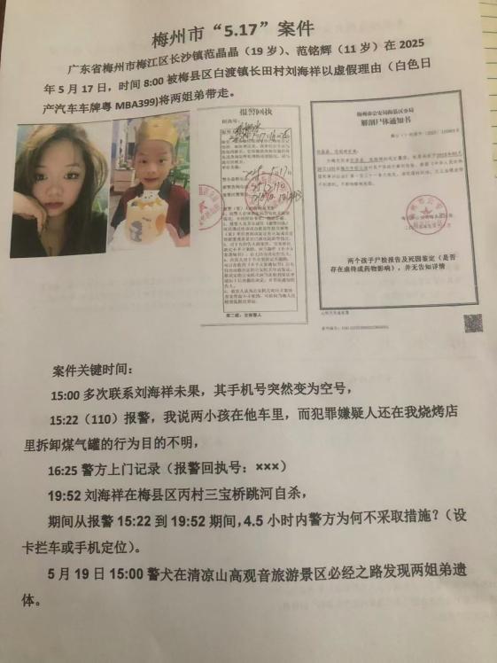 一.案件撤销决定书。2025年.7月1日.梅县公安局做出《撤销案件决定书》(梅公(刑)撤案字{2025}316024号)认为该案撤销决定可能违反法律法规,无出具《不立案理由说明书》《中华人民共和国刑事诉讼法第一百一十二条》说明撤案依据。二.案件重大疑点,依法侦察(据受害者母亲所说)1.作案动机不明,存在他人参与重大疑点2.作案过程存在多出疑点,一人作案不可能,案前后,行踪,通话录音,车辆活动,资金流水,社交软件。等3.关键证据未全面调取,明显疏漏,两小孩尸检报告及死因鉴定(是否存在虐待式药物影响)并无告知详情,三.案件性质恶劣,需彻查到底,维护法律公平正义。(不要以自杀为由)掩盖事实真相为借口!注明:(写了很多封申诉信,到目前也没个结果)本亲涉及两人被侵害致死、其中一人仅11岁,案情重大,社会舆论影响恶劣,唯有彻查真相,方能维护法律公平,彰显法律威严。 一位绝望母亲:庄柳冰