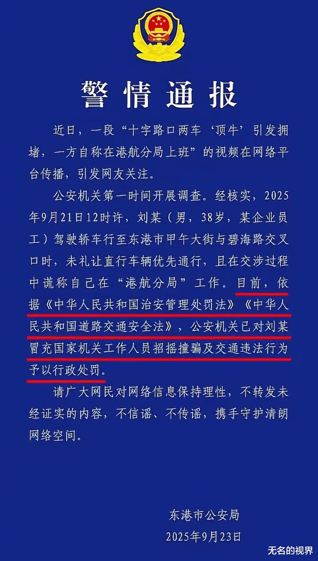 由事件发生后过了两天,也就是在9月的23号,东港市公安部门迅速进行调查,经过调查已核实并且发布通报,黑车驾驶员姓刘,实际情况是某企业的一名员工,并不是公安系统的相关人员,他驾驶的车辆在路口两车相遇,未礼让直行车辆优先通行,并在双方交涉过程中谎称自己是东港分局的工作人员,纯属存在了冒充公安机关人员的行为,根据中华人民共和国治安管理处罚法和中华人民共和国道路交通安全法相关条例法规,对刘某冒充国家机关工作人员招摇撞骗行为和交通违规行为予以相应的行政处罚。