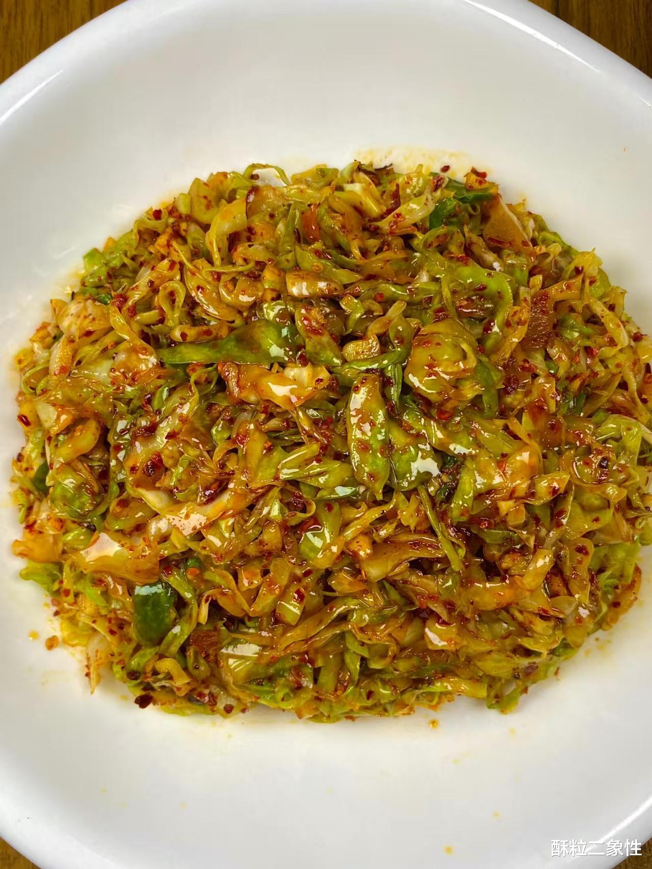 丝全进大碗,酱汁“哗啦”倒上去,戴手套抓抓抓,每根都裹满“红亮亮”。静置3分钟,包菜慢慢“缩水”,酸味钻进去,辣味爬上来,表面亮到“反光”!