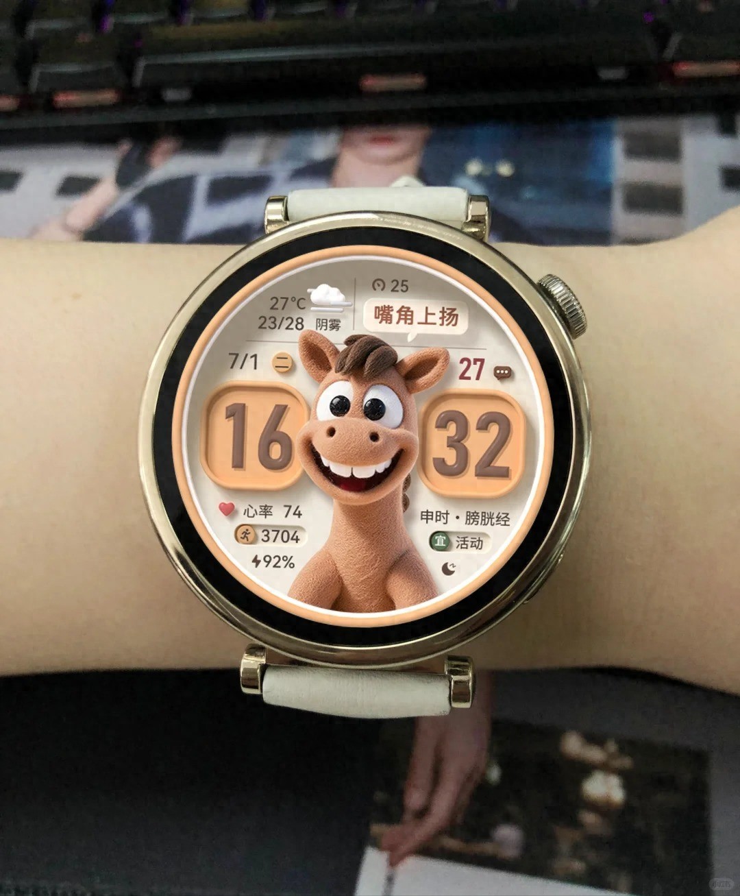 表盘功能显示非常丰富,点击还能切换“小马”的魔性表情,时间、日期、时辰、天气、压力、步数等快捷应用齐全。工作累了就看一眼小马咧嘴憨笑,掌握时间进度的同时,咱“牛马”也能有心灵上的安慰,既不影响整体可爱风,又让信息一目了然全盘在握。