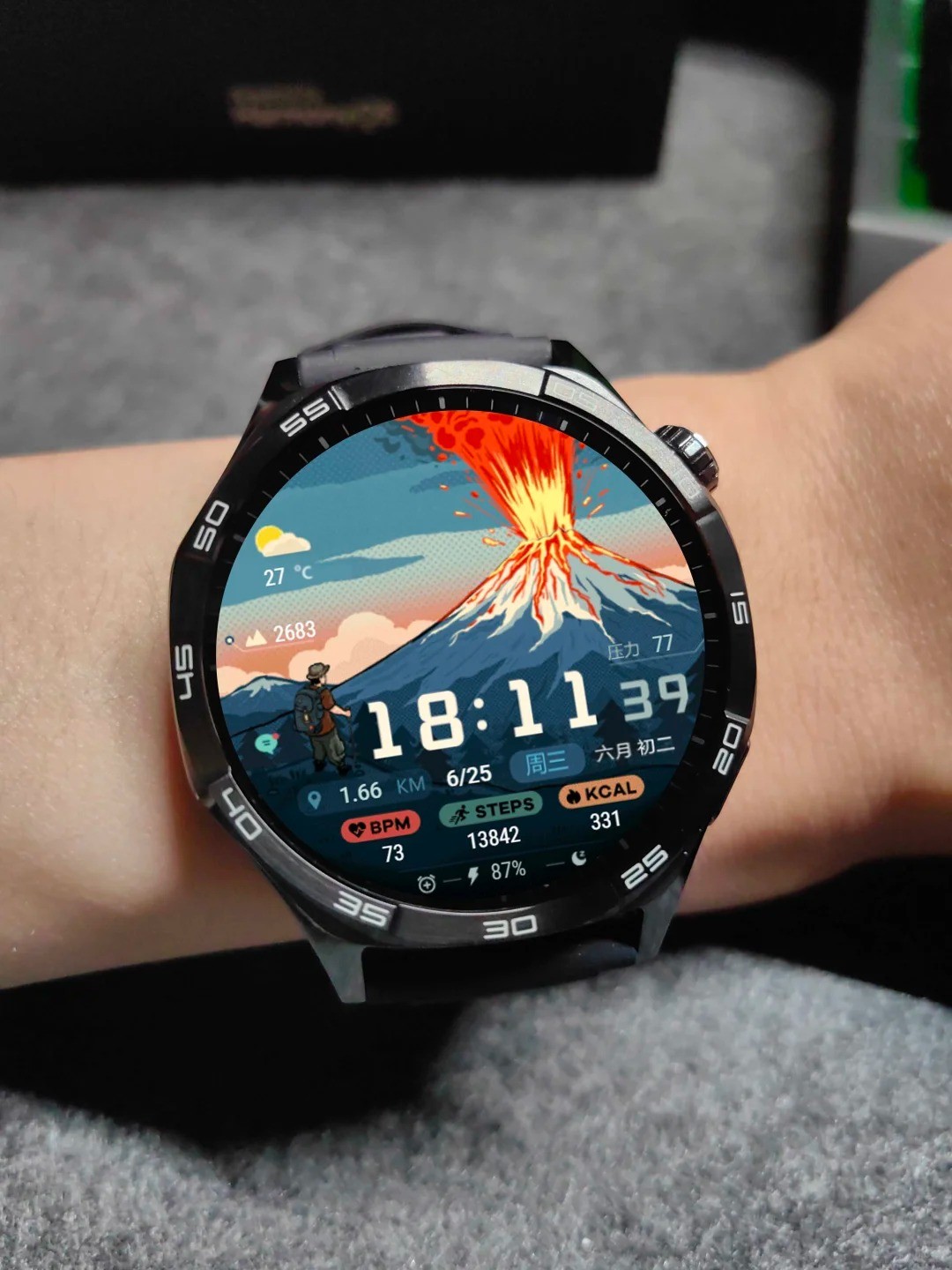 时间来到周五,一周的工作终于要结束,身体感觉被掏空,表盘换成“压力感知火山”。一座3D火山随着压力值变化随时“喷发”,感觉自己的工作能力到了极限,这个时候谁要让我加班,我的心情也像火山岩浆一样喷薄而出,太累会逼疯人的。这款表盘有步数、距离、卡路里、心率排成一排,时刻提醒着我注意身体健康情况,不要只想着工作,压力大了也要好好休息。
