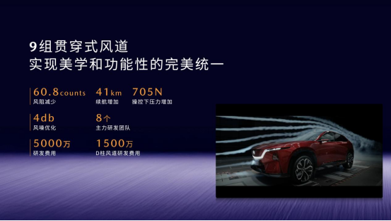 同级首创的9组贯穿式风道与7组空气动力学组件,让EZ-60在行驶过程中减少风阻60.8 counts,CLTC续航提升41km,长途出行时节能效果显著;在高速行驶时,后轴可获得最高705N的稳定下压力,大幅提升行驶稳定性;同时,多风道的设计,有效梳理车身表面乱流,让风噪优化4dB(A),车内环境更加静谧,为用户营造舒适的驾乘空间。