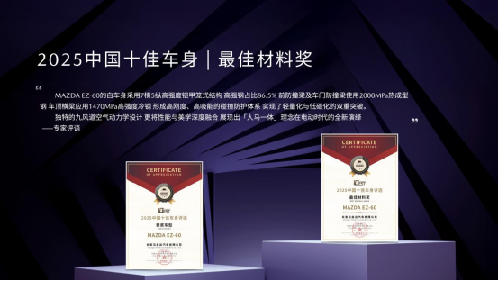 安全是马自达刻在骨子里的DNA,是所有驾乘愉悦的前提。EZ-60通过“实战测试+权威认证”双维度,树立了新能源中型SUV安全领域的新标杆,为用户的每一次出行保驾护航。9月,EZ-60在“勇士之路”丙察察成功完成行业首个“整车碰撞/翻滚/浸水”连环挑战,并荣获中汽中心颁发的“TOP Safety”顶级安全证书,展现出卓越的安全性能。同月再次斩获“2025中国十佳车身”及“最佳材料奖”两项大奖。