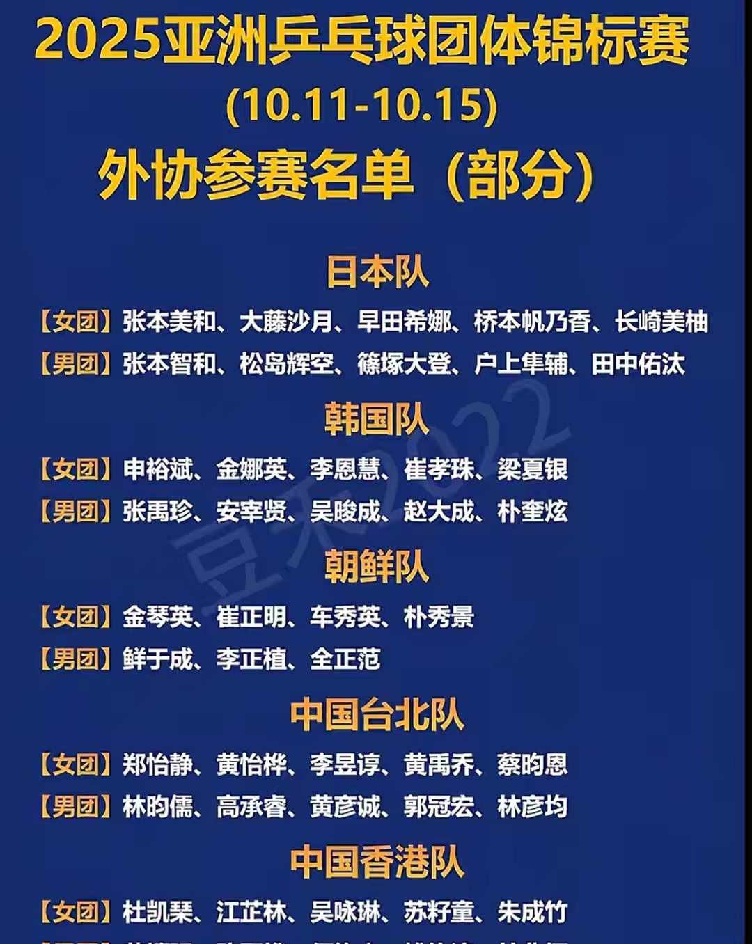 对手方面,日本队派出张本智和、早田希娜等主力,韩国队则由申裕斌、张禹珍领衔,各支强队均以最强阵容出战,使得本届亚锦赛竞争异常激烈。