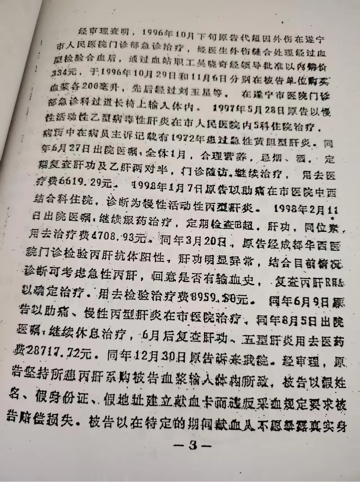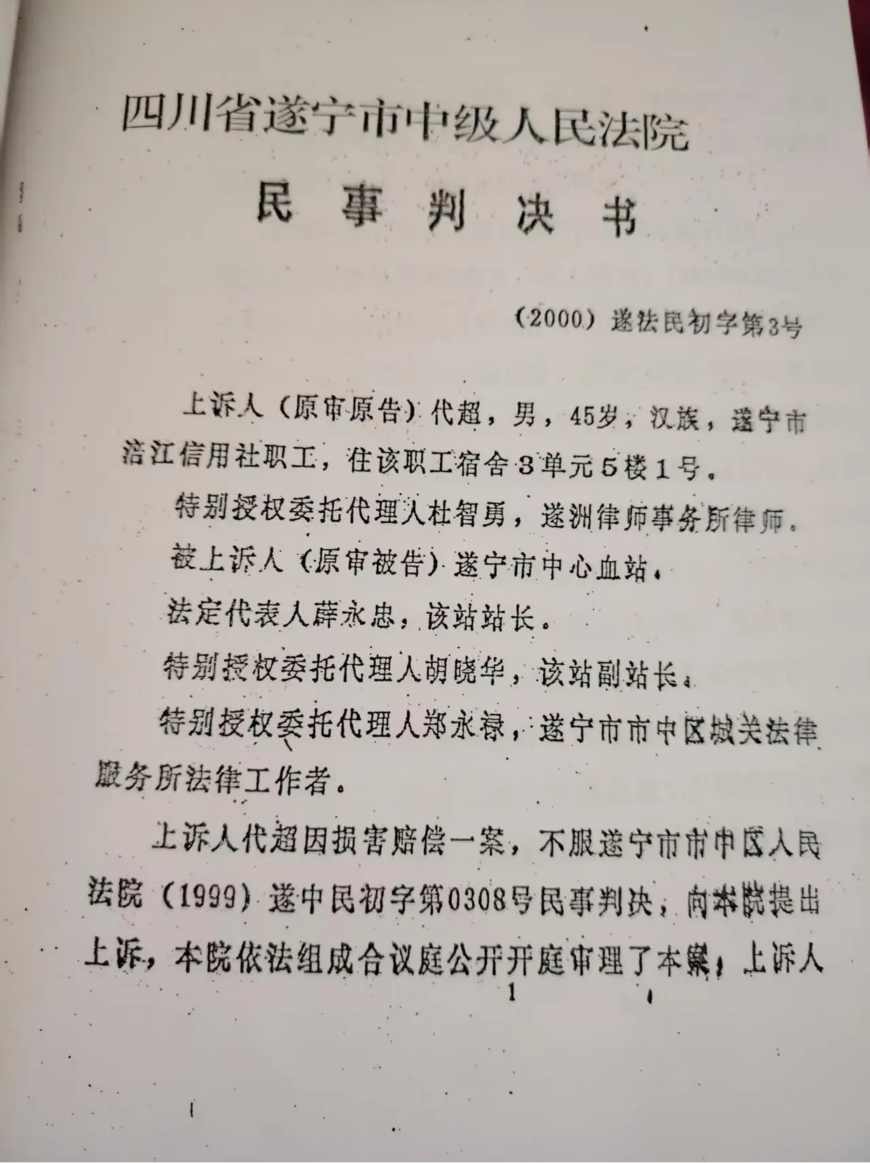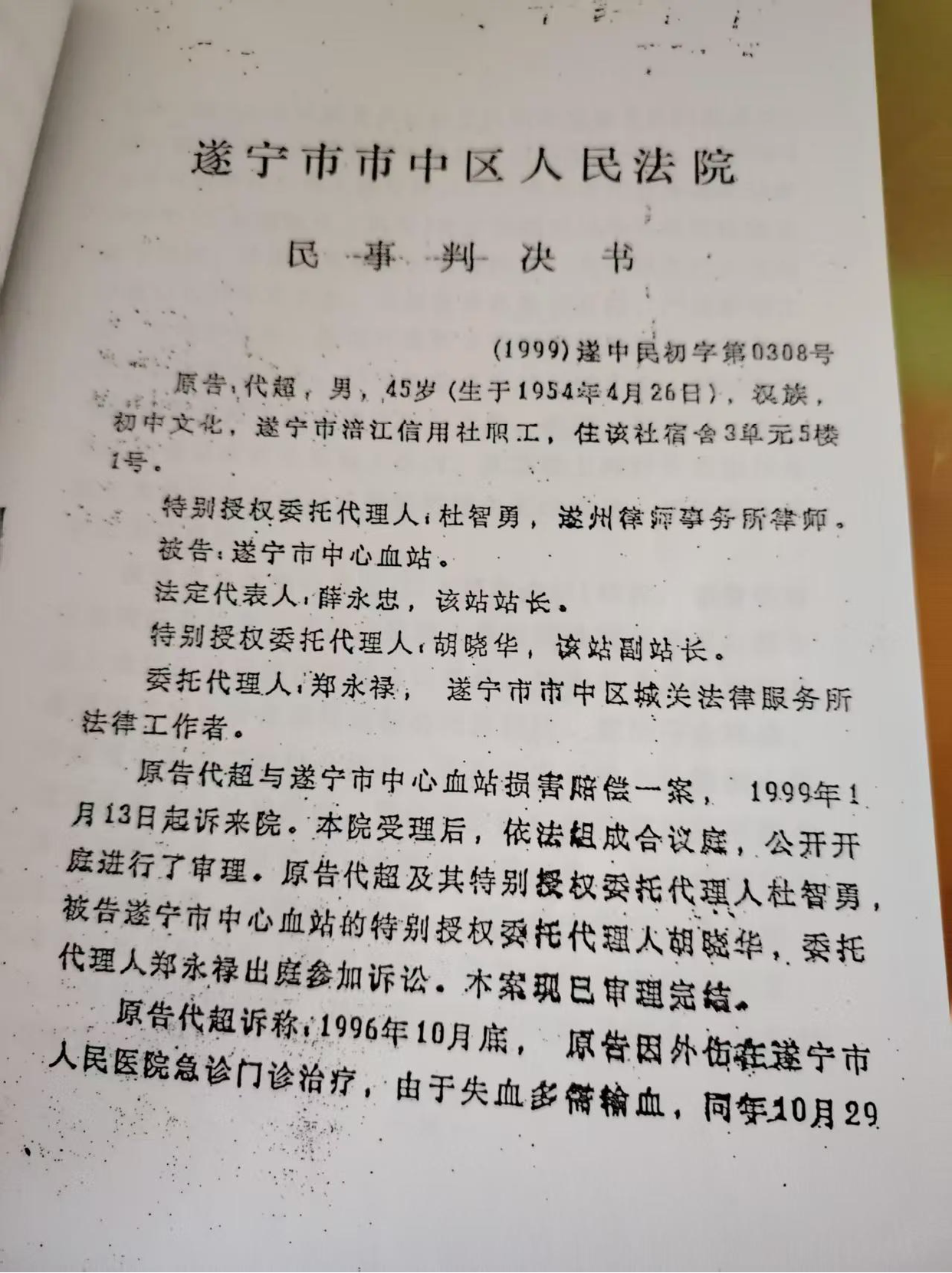 1997年5月,代超被诊断出患有慢性活动性丙型肝炎,随后在四川省遂宁市人民医院住院治疗。1998年1月,他再次因同病住院。同年3月,成都华西医院的检验结果确认其丙肝抗体呈阳性。所有证据都指向了1996年在四川省遂宁市中心医院的那次输血。