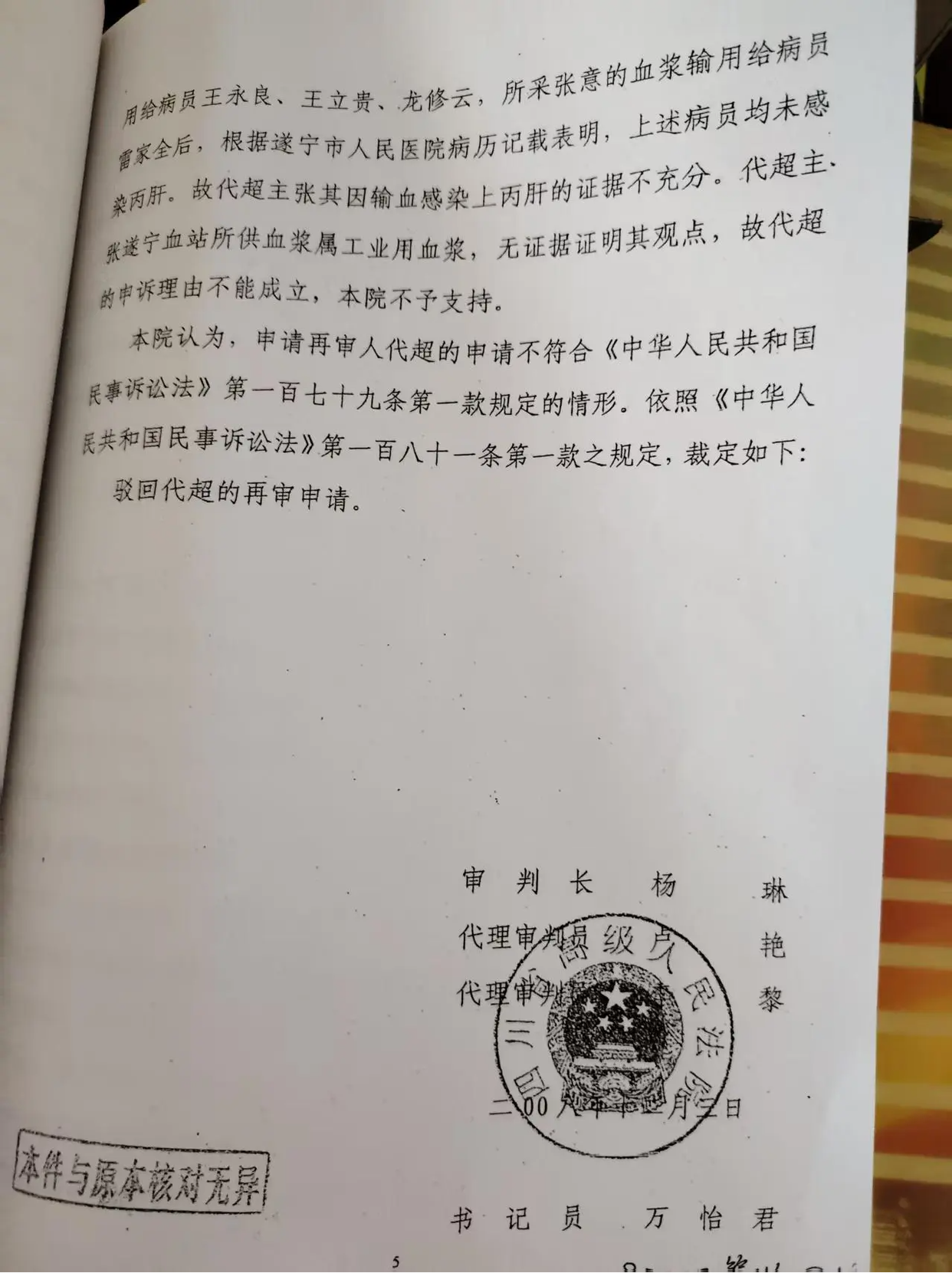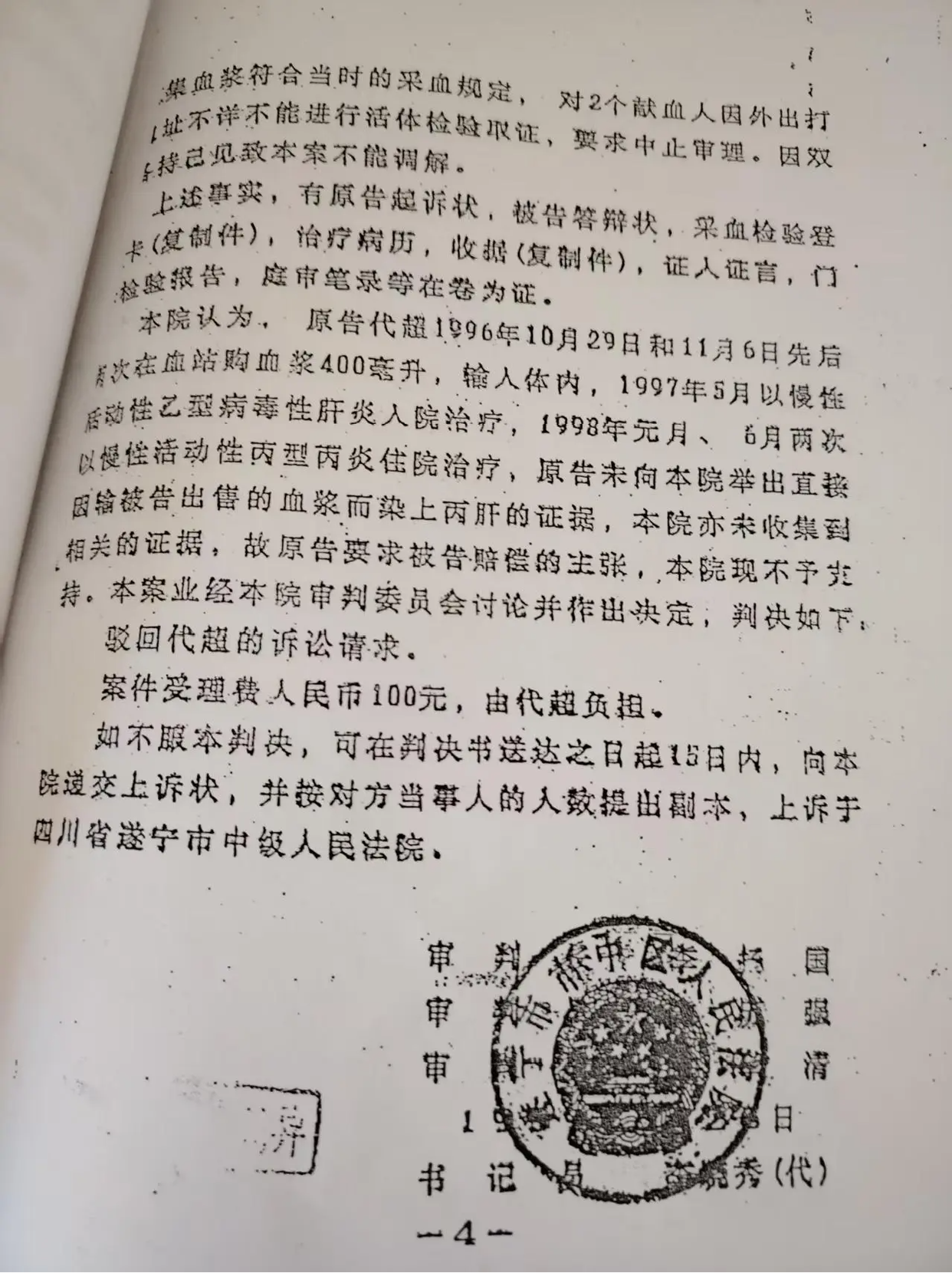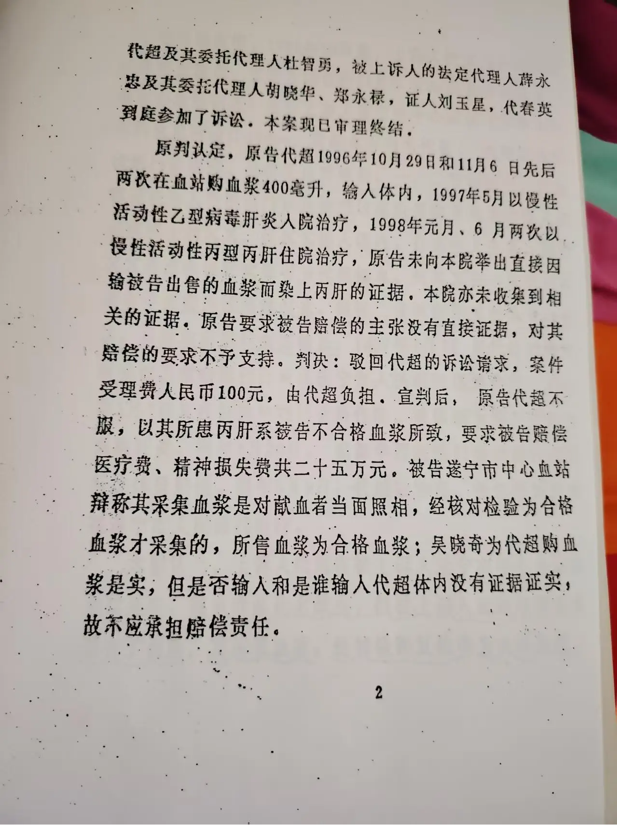 1997年5月,代超被诊断出患有慢性活动性丙型肝炎,随后在四川省遂宁市人民医院住院治疗。1998年1月,他再次因同病住院。同年3月,成都华西医院的检验结果确认其丙肝抗体呈阳性。所有证据都指向了1996年在四川省遂宁市中心医院的那次输血。