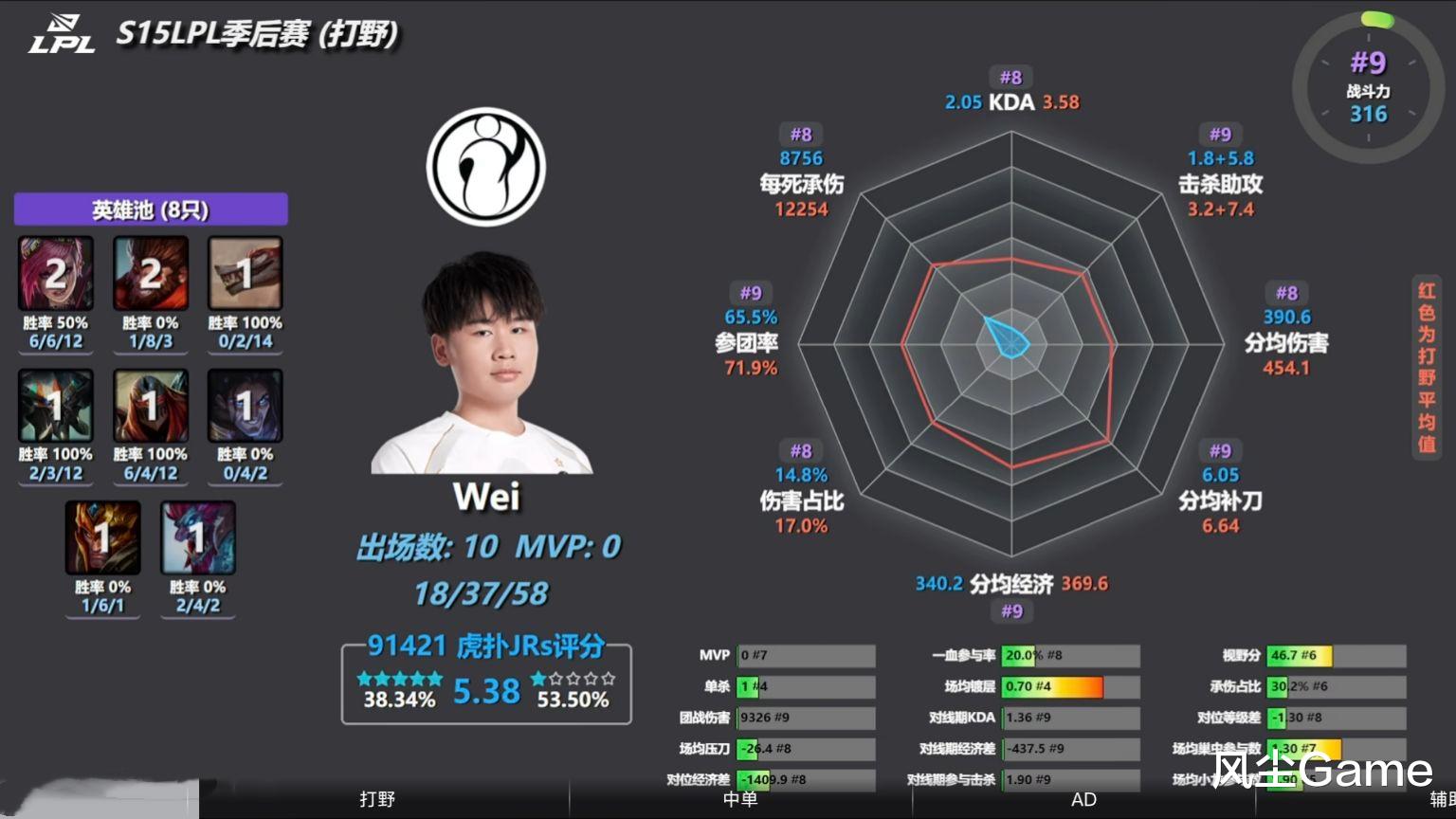 Wei的伤害占比、分均伤害、死亡承伤、KDA四项数据,都在同位置排名第八,而参团率、分均经济、分均补刀、击杀助攻这四项,则是同位置垫底排在第九,一共8支队伍,9位打野选手,Wei的所有数据,不是倒一就是倒二,这确实有点抽象,EDG小浩、NIP奶油,部分数据都是前三。