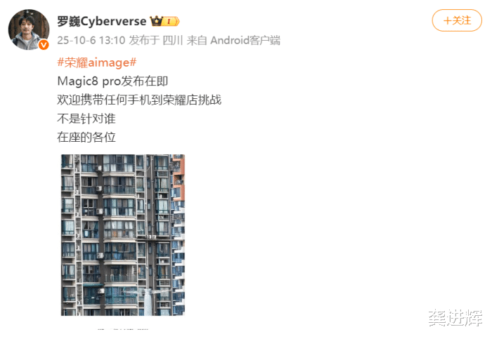 10月6日下午,罗巍在微博上写道,“Magic8Pro发布在即,欢迎携带任何手机到荣耀店挑战,不是针对谁,(而是)在座的各位。”他的言下之意是,荣耀Magic8Pro的影像实力非常强悍,足以吊打市面上任何一款旗舰机,可见他对自家产品高度自信。