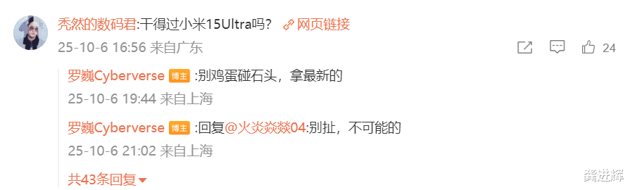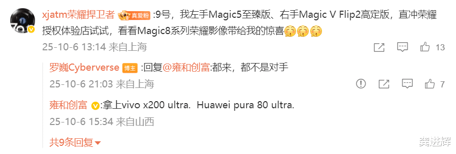 在此条微博的评论区,罗巍进一步叫板各大友商。比如,有网友问干得过小米15 Ultra吗?他说,“别鸡蛋碰石头,拿最新的。”说白了,罗巍认为小米15 Ultra是鸡蛋,而荣耀Magic8 Pro是石头,即便拿最新的小米17 Pro Max与荣耀Magic8 Pro PK影像,也未必能占到多少便宜。