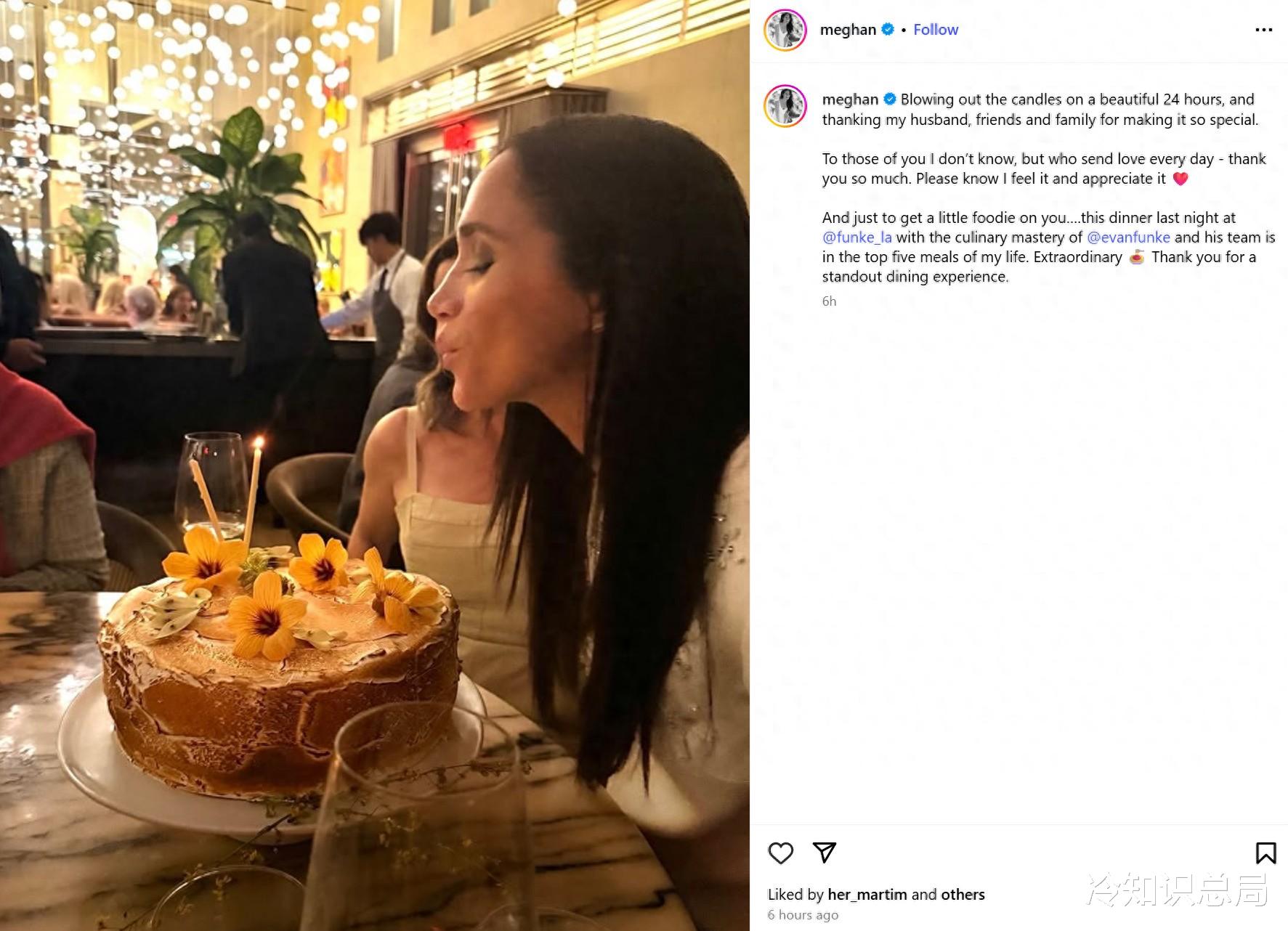 当地时间8月5日,梅根在社交媒体上最新发布了一张在餐厅庆祝44岁生日的照片。
