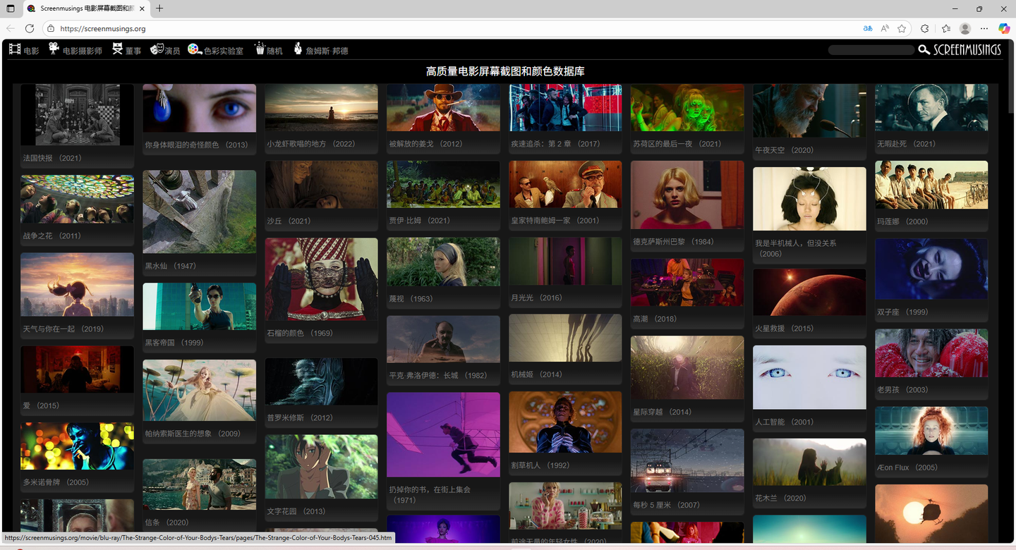 6、ScreenMusings这是一个专门收录电影高清截图,并能精准按色彩和电影元素筛选的变态网站。看电影时惊艳到你的那些画面,不用再费劲自己截图了。这里通通都有高清原图,一搜即得。
