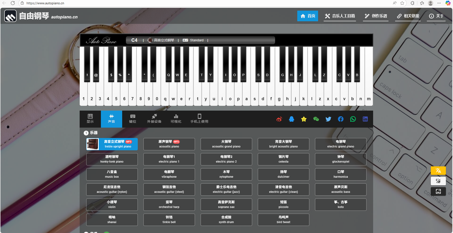 3、自由钢琴这是一个可以在线弹奏钢琴的网站。琴键上标注了对应在键盘的位置,只需要按键盘就能发出对应的钢琴声而且可以切换不同的乐器,例如大提琴,竖琴等而且还提供了对应的键盘乐谱,点击键盘就能弹出对应的音乐。