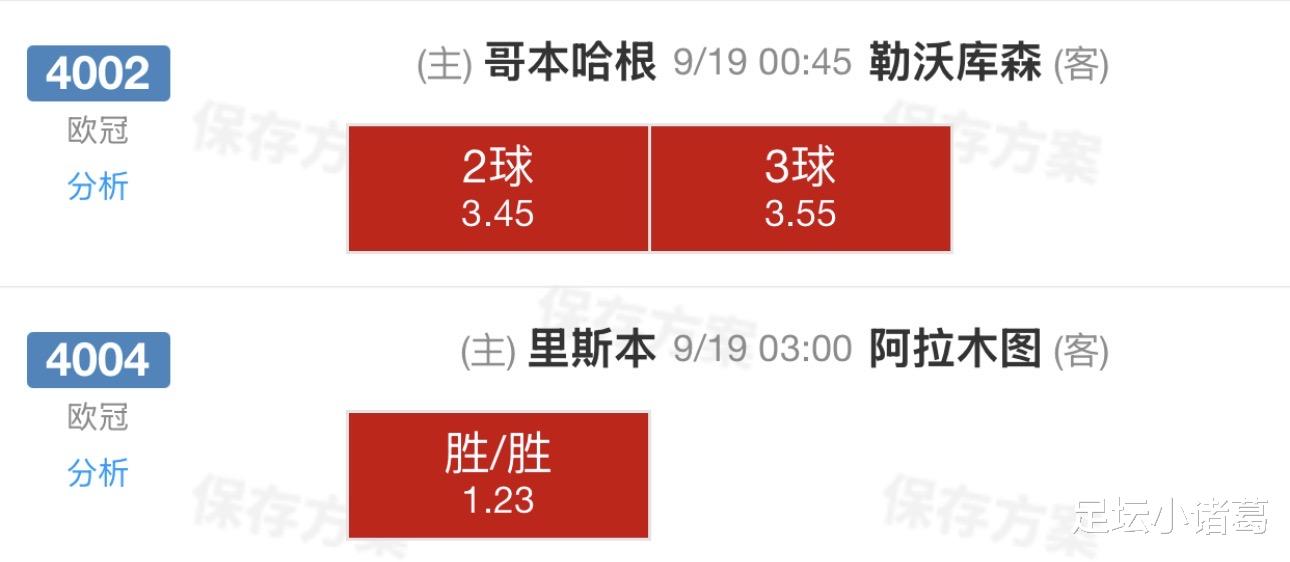 综合分析:从纸面实力上来看,勒沃库森全队身价接近哥本哈根全队身价的9倍,显然勒沃库森阵容实力要远胜于哥本哈根,但勒沃库森的水位也太高了,我不信主任会这么好心。